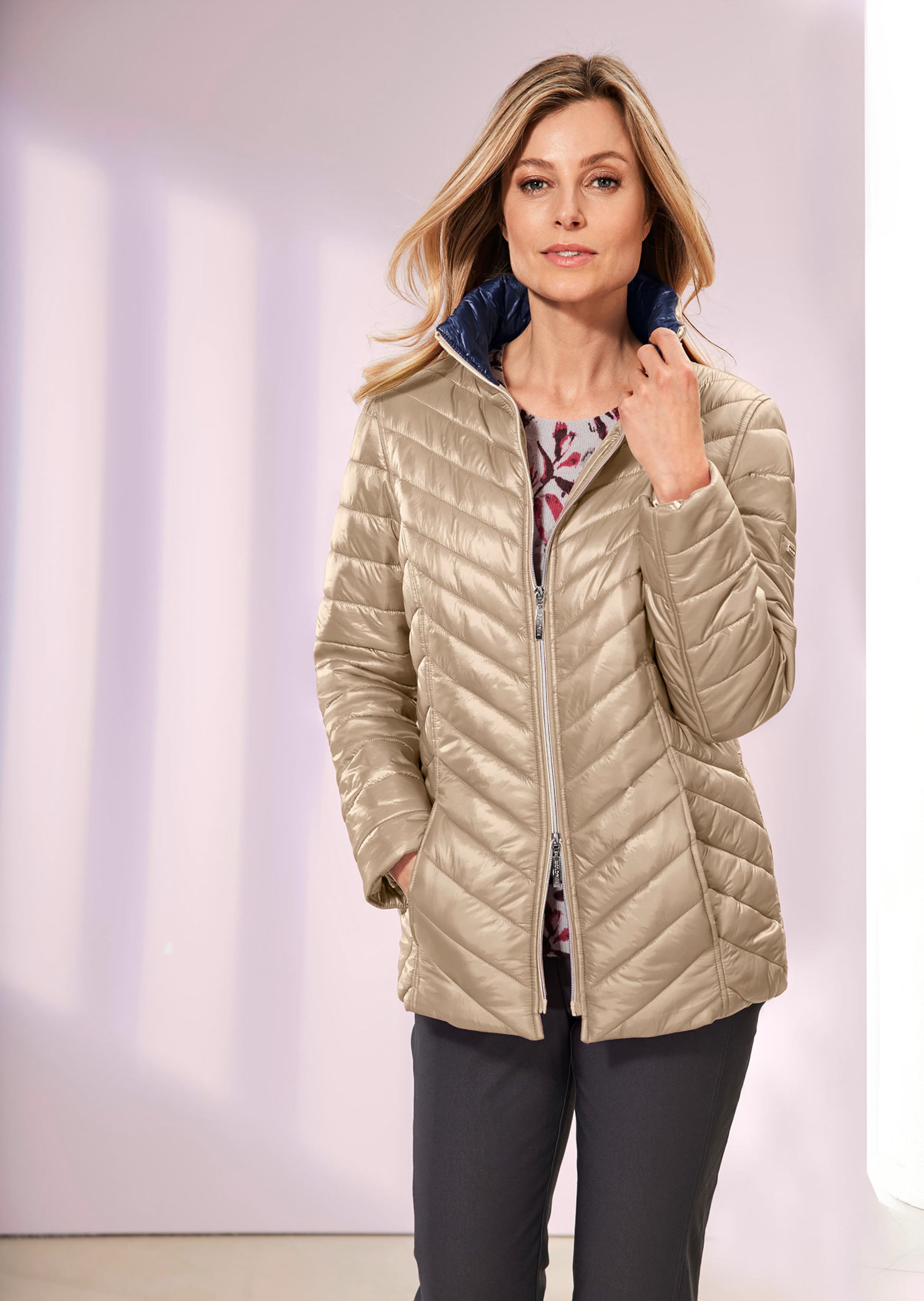 Steppjacke mit modischem Diagonalstepp: Schmeichelt der Figur, ohne dabei aufzutragen. Ultraleicht und knitterunempfindlich wie echte Daune. Mit edlem Zwei-Wege-Reissverschluss, Wiener Naht, leicht wattierten Ärmeln und Eingrifftaschen. Kapuze im Kragen verstaubar. Länge ca. 71 cm in Gr. 46, ca. 67 cm in Gr. 23.