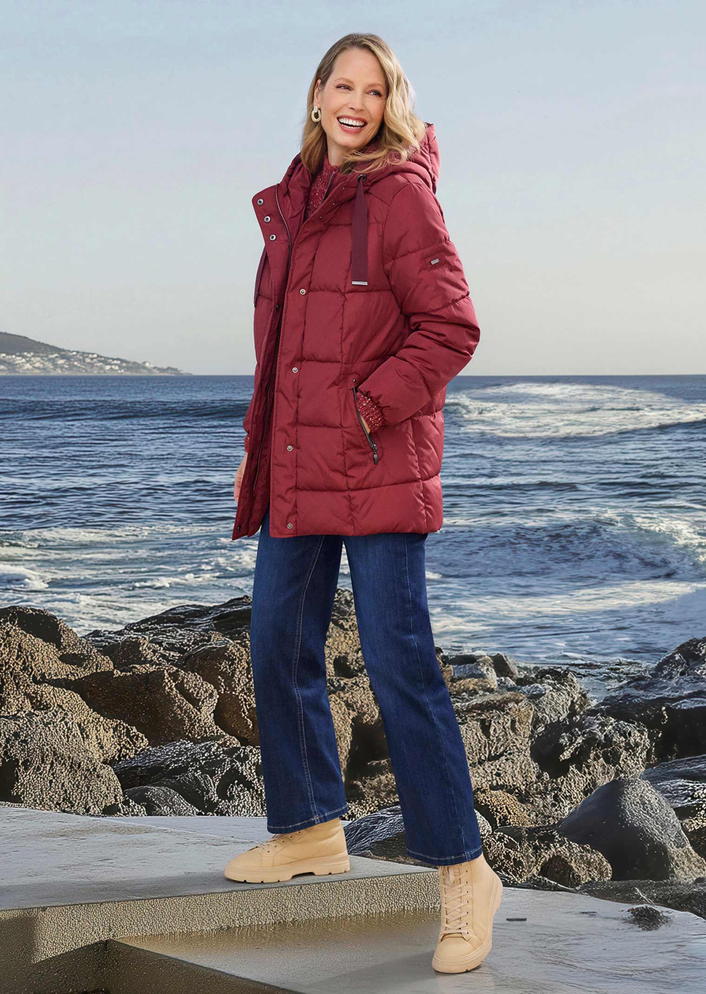 Lange Steppjacke in leichter A-Linie. Die modische Optik wird durch breite Ripsbänder an der Kapuze und einer aparten Quersteppung betont. Mit aufwändigen Reissverschlusstaschen gearbeitet und zusätzlicher Druckknopfblende am Reissverschluss. Der dezente, edle Glanz rundet das Modell absolut gelungen ab. Länge ca. 83 cm in Gr. 46, ca. 79 cm in Gr. 23.