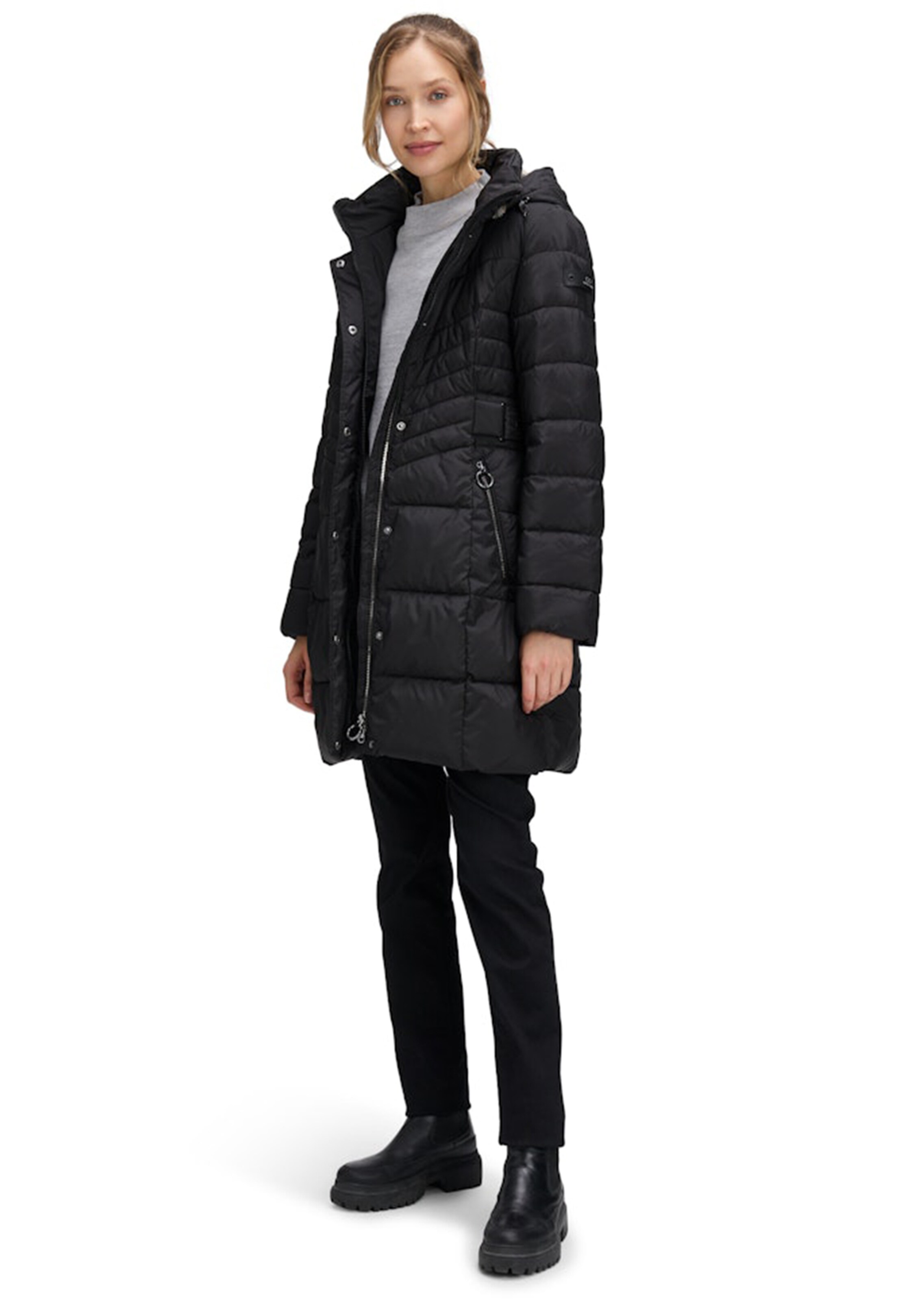 Steppmantel mit Kapuze von BETTY BARCLAY in leicht taillierter Passform und mit hübschen Zierriegeln in der Taille. Mit warmer Kunstdaune weich gefüllt und feminin abgesteppt bietet das Modell besten Komfort und Schutz: Die mit Webpelz gefütterte Kapuze lässt sich in der Weite regulieren und nach Wunsch abnehmen. Der 2-Wege-Reissverschluss mit Druckknopfblende hält die Kälte zuverlässig fern. Mit praktischen Reissverschlusstaschen und einer Futterinnentasche. Länge ca. 92 cm in Gr. 46.