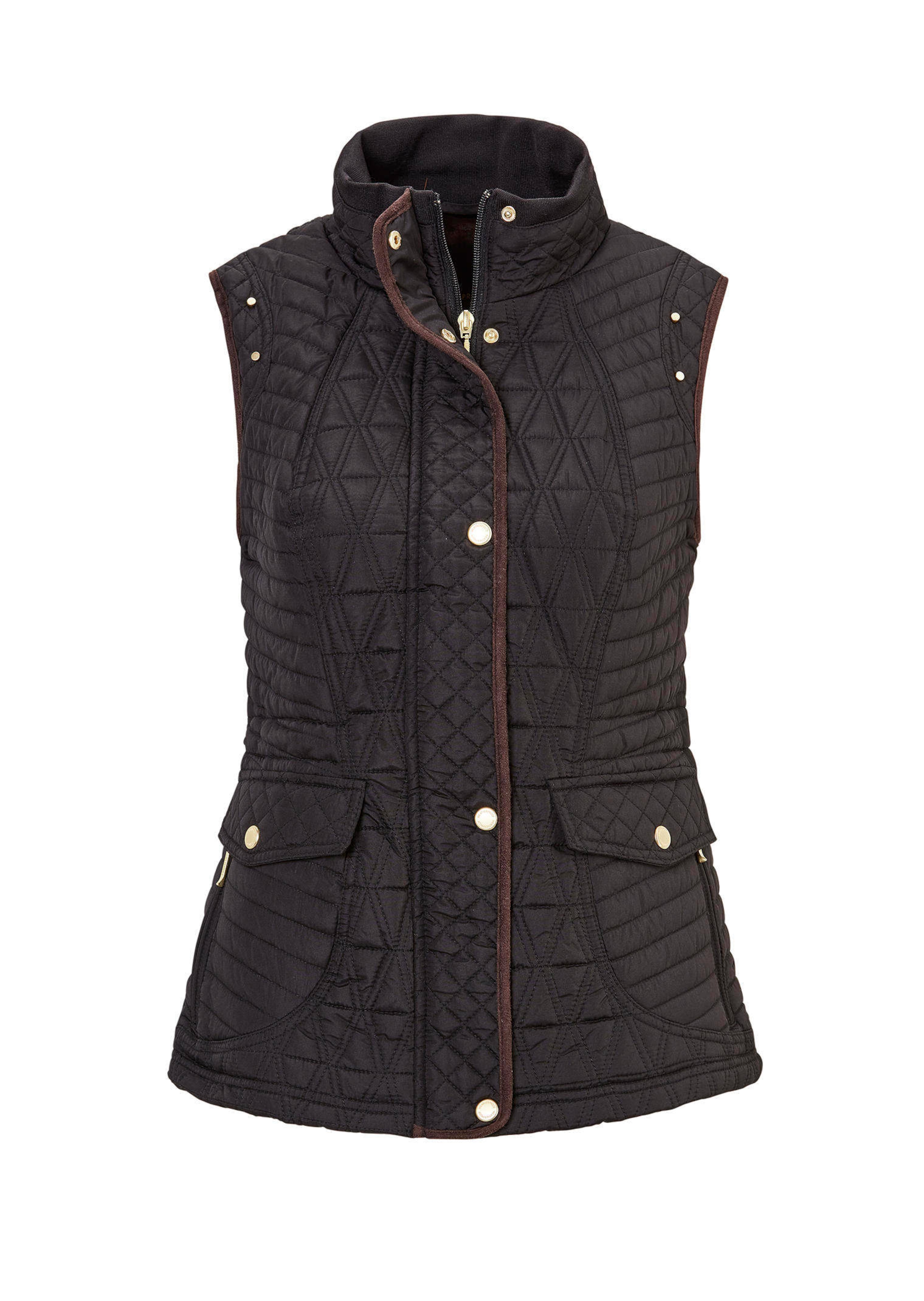 Steppweste in spannendem Minimal-Dessin: Drei verschiedene kleine Steppmuster – von Raute über Zickzack bis Querstepp – sind hier raffiniert zu einem figurschmeichelnden Dessin zusammengesetzt. Die Passformnähte und der Gummizug in der Taille formen eine schlanke Silhouette. Der praktische Reissverschluss mit Druckknopfblende reicht bis in den hohen Stehkragen, so ist der Hals gut vor Kälte geschützt. Die aufgesetzten Taschen mit Patten und Druckknopf bieten einen zusätzlichen Reissverschluss an der Seite: So bleiben Ihre Wertgegenstände sicher. Mit warmem Fleece gefüttert für ein kuscheliges Wohlgefühl. Druckknopfblende und Armlochabschluss hochwertig eingefasst. Dieses Modell fällt eine Nummer kleiner aus. Bitte bestellen Sie die Weste eine Nummer grösser als gewohnt.