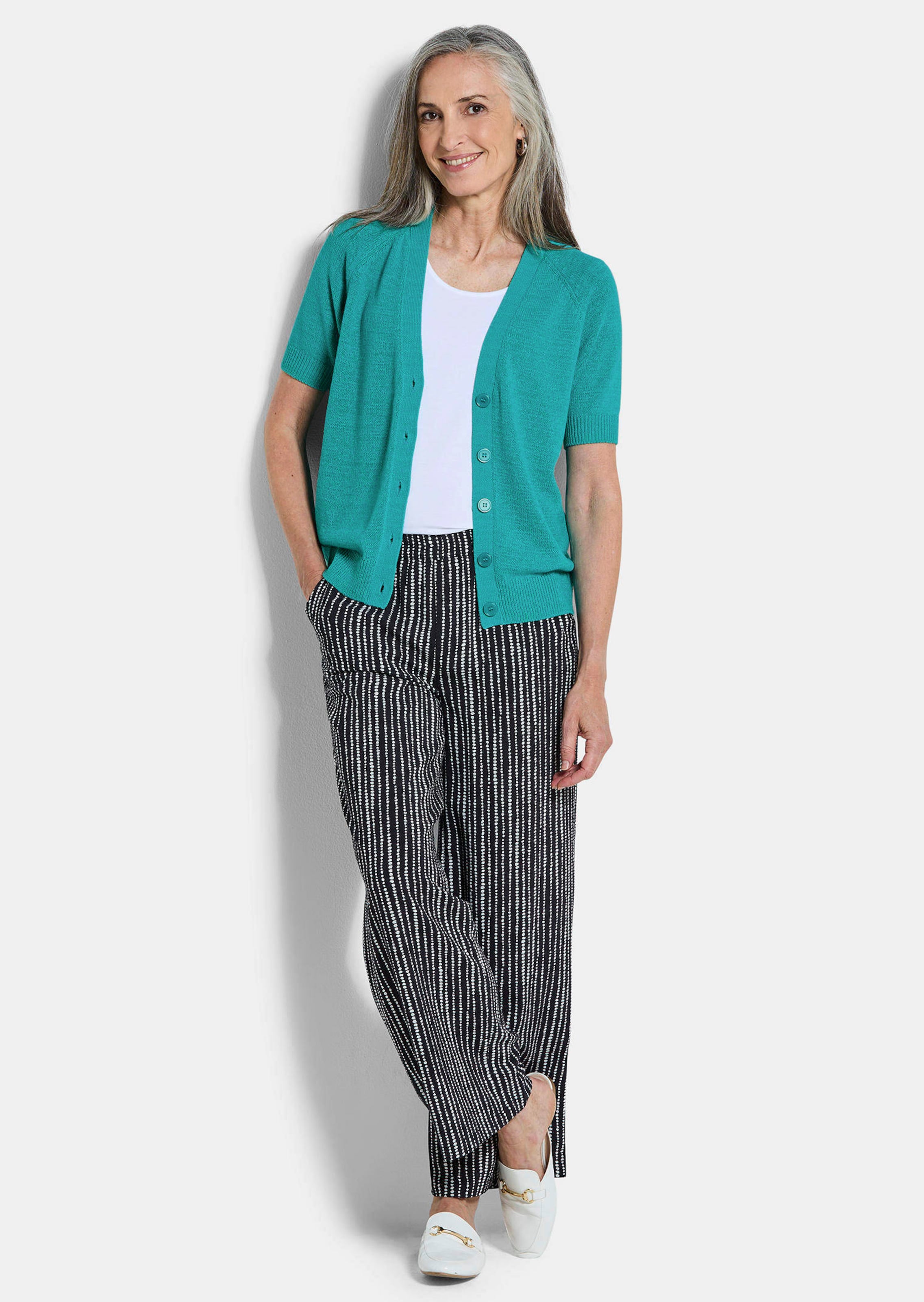Strickjacke aus kühlem Bändchengarn mit Baumwolle – perfekter Tragekomfort an warmen Tagen. Das Modell in gerader Passform mit halblangen Raglanärmeln ist mit hochwertigen Minderungen gestrickt. Rippenbündchen an den Säumen bilden einen schönen Abschluss. Cardiganausschnitt mit flacher, beiterer Blende. Grössere Knöpfe in der passenden Farbe vervollständigen das Modell. Länge ca. 65 cm in Gr. 46, ca. 61 cm in Gr. 23.