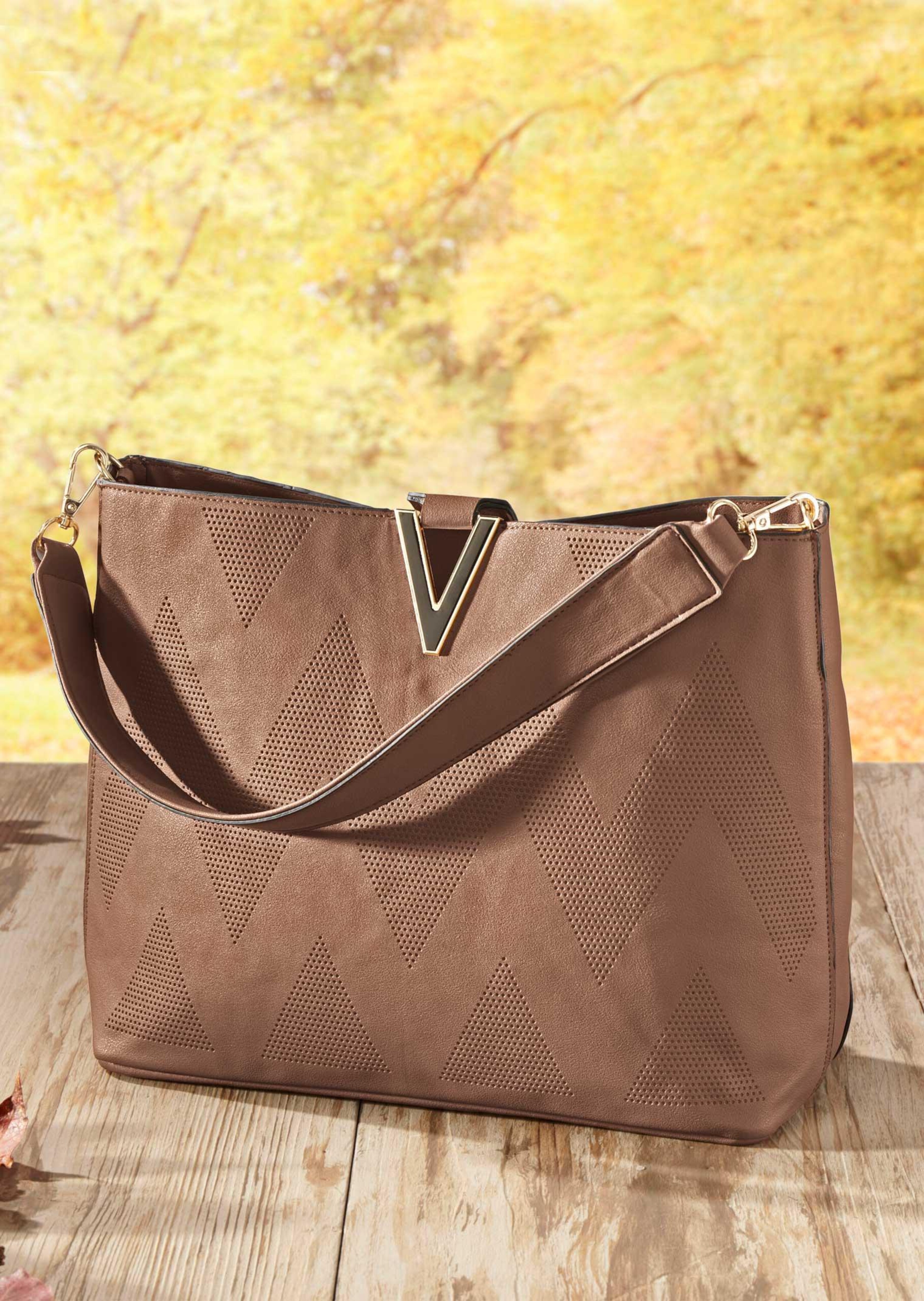 Praktische Handtasche mit Henkel aus edlem aber dezentem Chevron-Muster. Die V-Form dieses Musters findet sich am magnetischen Taschenverschluss wieder. Geräumiges Innenfach.