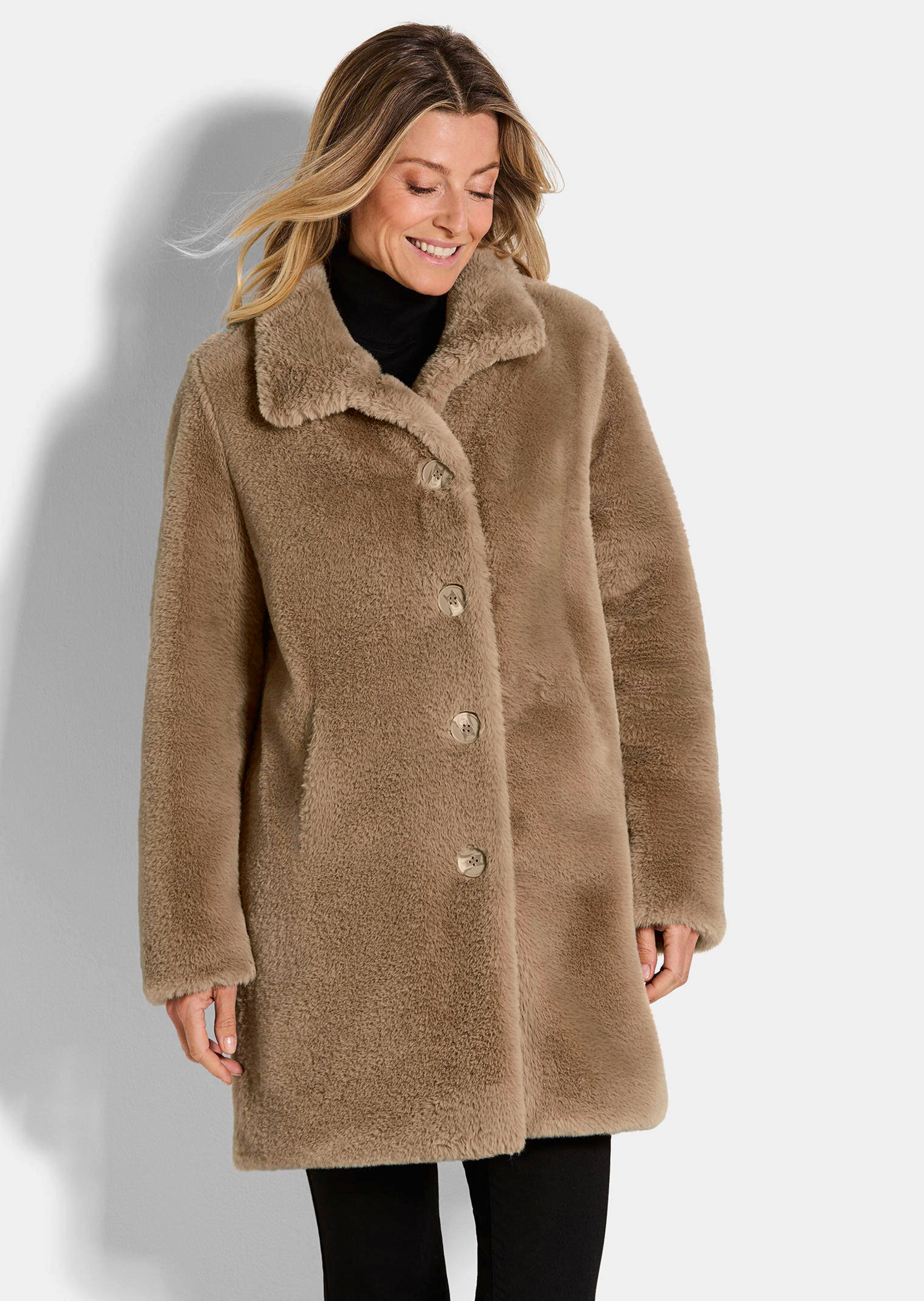 Mantel von BARBARA LEBEK in Fell-Optik – so kuschelig, weich und warm, dass Sie ihn gar nicht mehr ausziehen wollen! Leicht ausgestellte Passform mit hohem Stehkragen, der auch umgelegt werden kann. Das Innenfutter ist mit modischem Animal Print bedruckt. Der Mantel lässt sich mit tonigen Knöpfen schliessen, dank der gefütterten Eingriffstaschen bleiben auch die Hände warm. Praktisch: Die Futterinnentasche, die Ihre Wertsachen sicher verwahrt. Länge ca. 88 cm in Gr. 46.