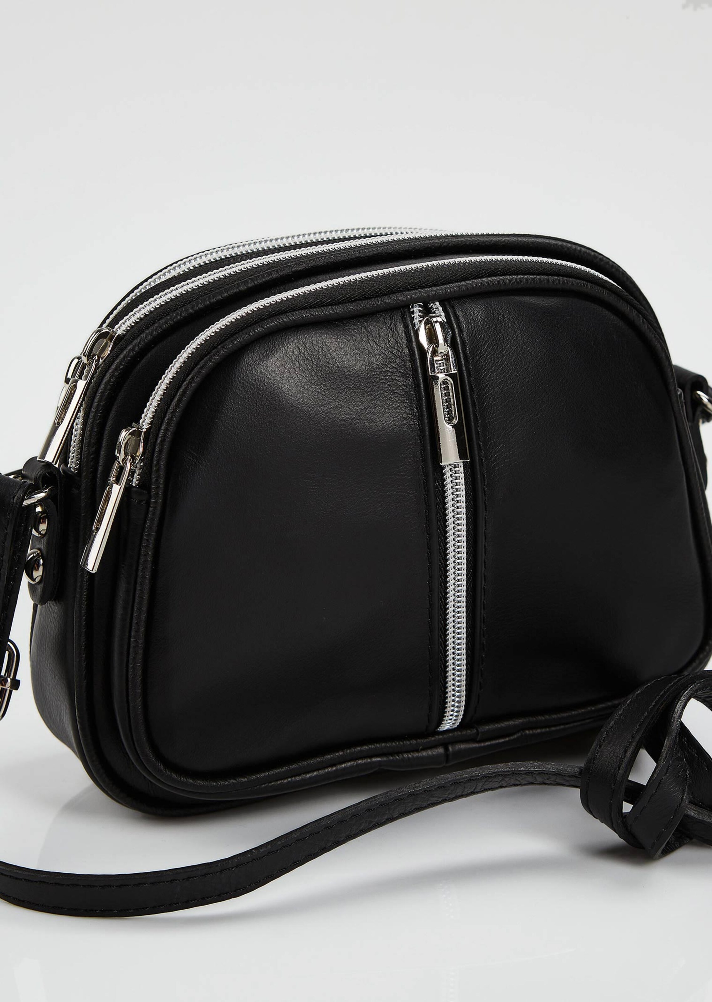 Umhängetasche aus echtem Leder. Klein, aber fein präsentiert sich die in Italien gefertigte Tasche mit drei grossen und einem kleinen Fach mit silberfarbenen Reissverschlüssen. Die schwarze Kontrastpaspel setzt einen optischen Akzent. Der schmale Schulterriemen kann individuell in der Länge verstellt werden.
