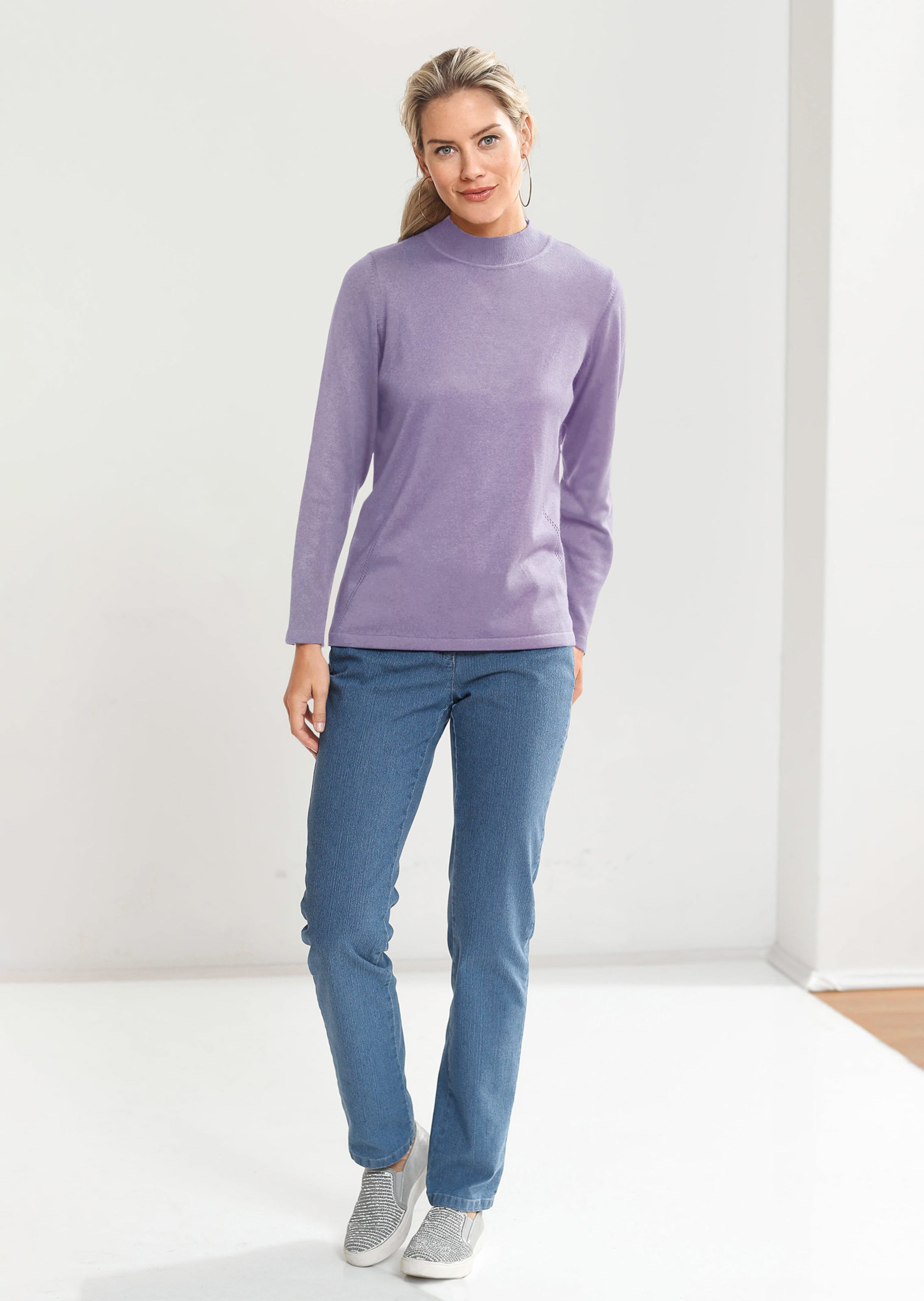 Stehbundpullover in hochwertiger Feinstrickqualität, die sich wunderbar weich und geschmeidig trägt. Schöne Ajour-Elemente vorne sorgen für eine effektvolle Optik. Das herrlich pflegeleichte Modell wurde aufwändig in Form gestrickt und garantiert beste Passform. Modisch glatte Abschlüsse. Länge ca. 67 cm in Gr. 46, ca. 63 cm in Gr. 23.