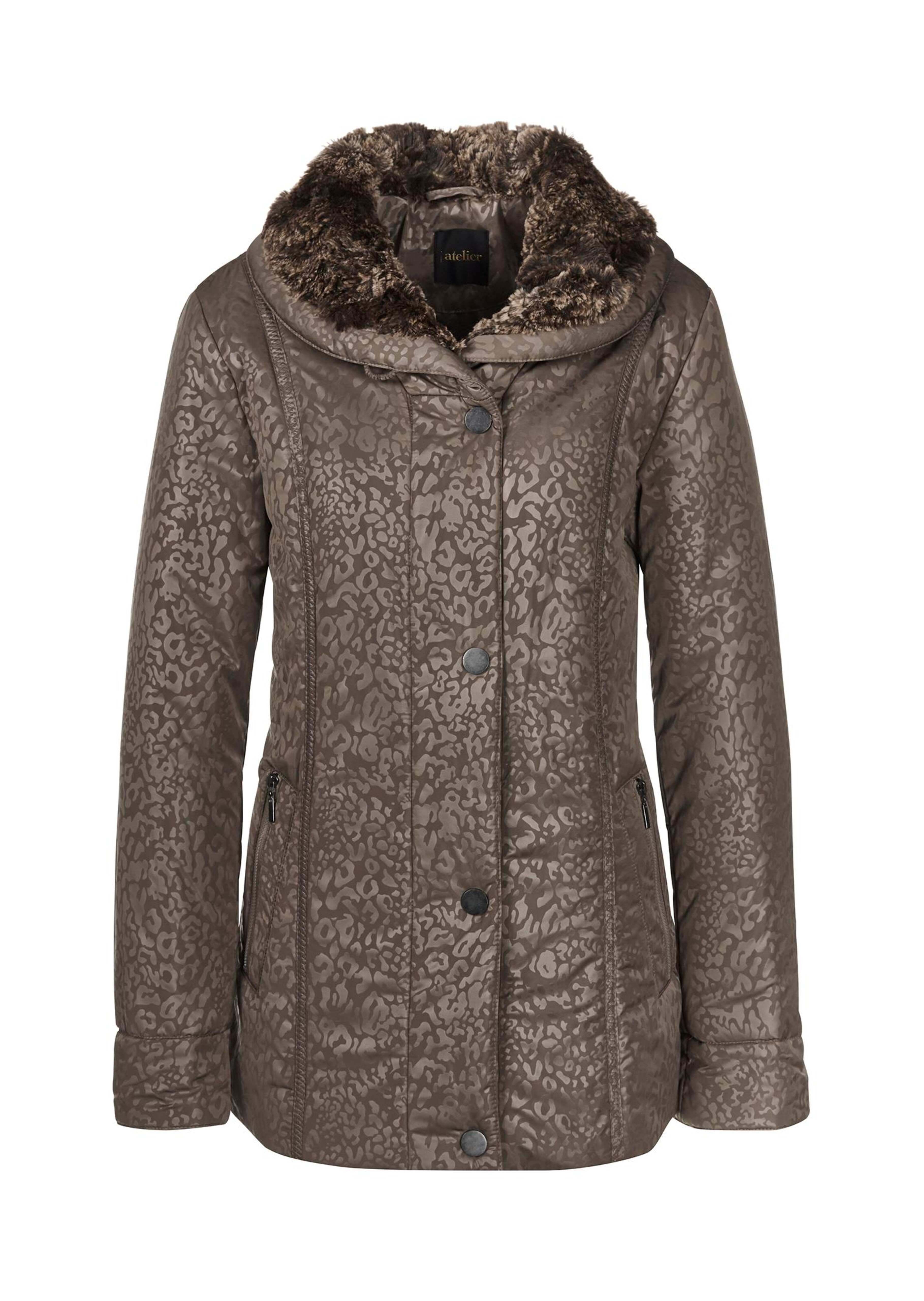 Jacke mit Fellimitat: Warm wattiert, mit tonigem Leo-Druck und edlem Schimmer. Der Kragen ist mit kuscheligem Fellimitat-Besatz gearbeitet und kann mit einem zusätzlichen Knopf hochgeschlossen werden. Doppelt zu schliessen, mit Reissverschluss und Druckknöpfen. Zwei Reissverschlusstaschen, innen mit Handy- und Futterinnentasche. Länge ca. 76 cm in Gr. 46.