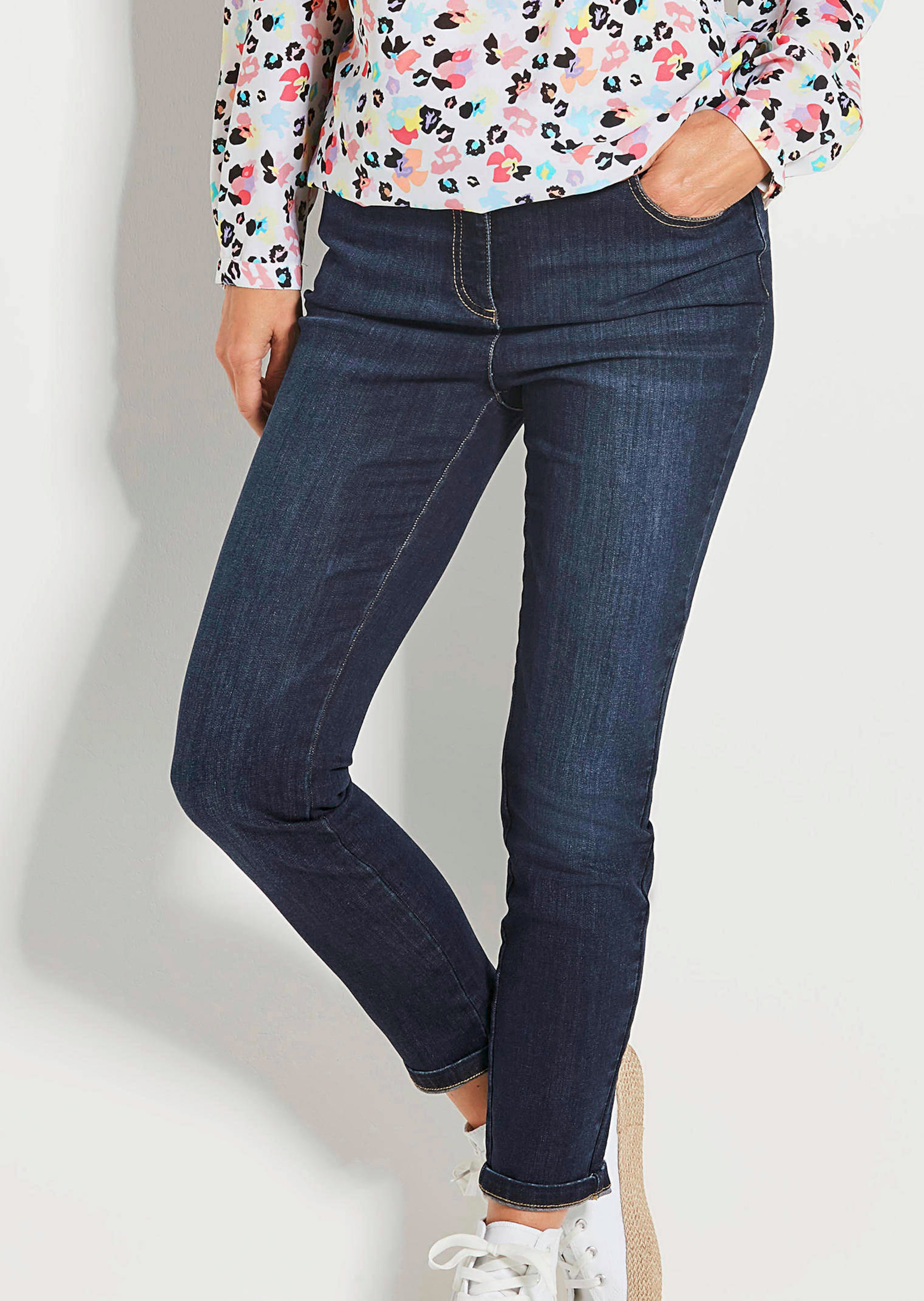 7/8-Jeanshose BELLA mit seitlichem Dehnbund. Die verkürzte Hose im schmal geschnittenen 5-Pocket-Stil schenkt optimale Bewegungsfreiheit und besten Tragekomfort. Ausgestattet mit abgerundeten Eingriffstaschen, die zusätzlich mit Nieten besetzt sind, sowie rückwärtigen Taschen, die von einer Stickerei und funkelnden Strasssteinen betont werden. Saumweite ca. 32,5 cm. Extra schmaler Beinverlauf.