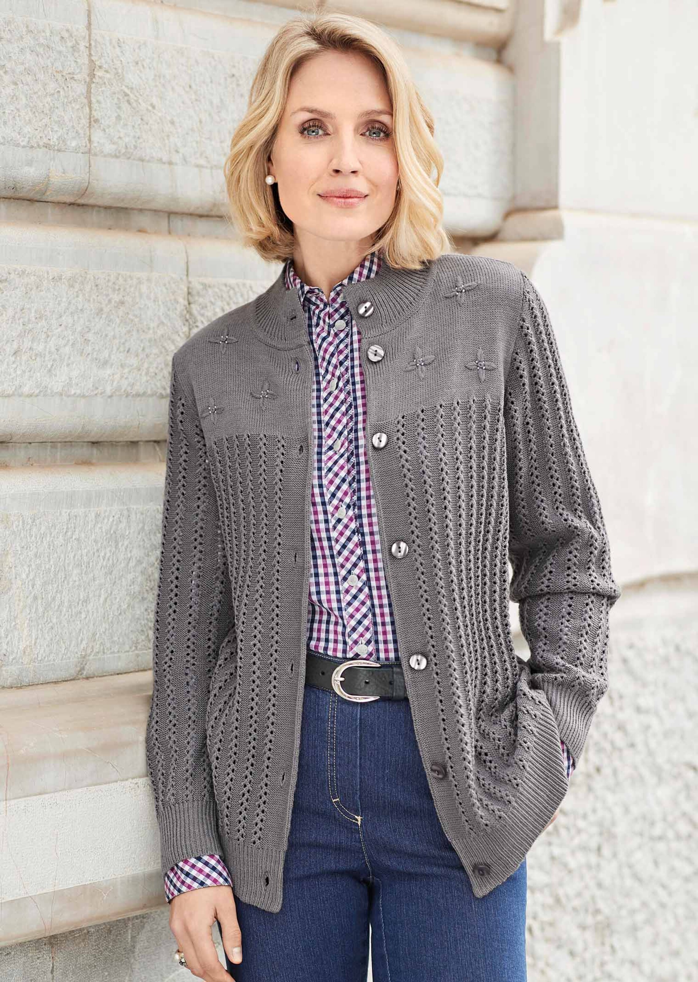 Strickjacke mit zartem Streifenmuster, das eine besonders schlanke Silhouette zaubert. Hübsch ist der Intarsienstrick mit Blüten und kleinen, glänzenden Zierperlen. Durch die dezente Farbgebung ist sie ein schönes Kombinationstalent für unterschiedlichste Looks. Mit kleinem Stehbund und farblich passender Knopfleiste detailverliebt gearbeitet. Länge ca. 67 cm in Gr. 46, ca. 63 cm in Gr. 23.