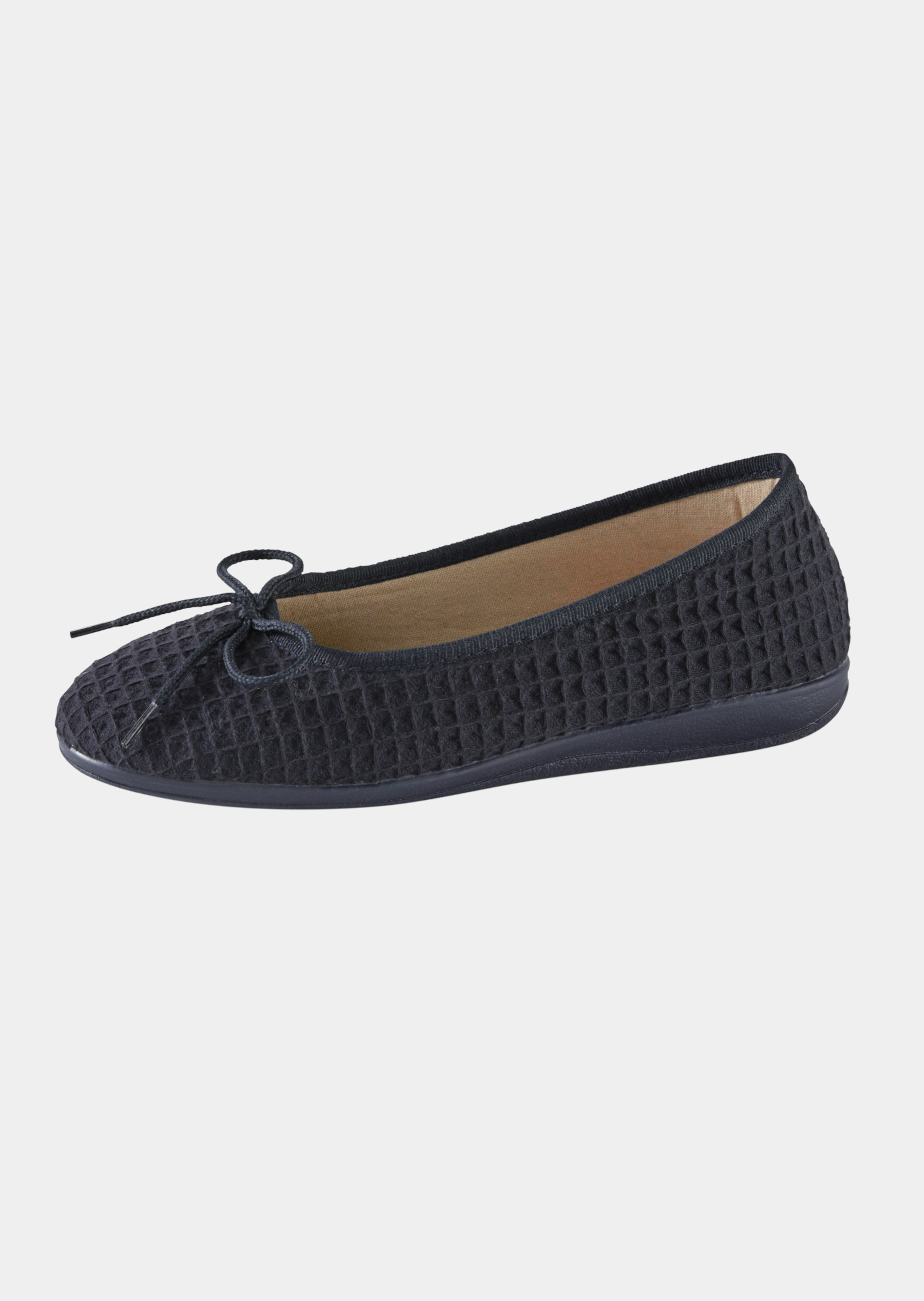 Hausschuhe in F-Weite, die dank der Ballerina-Form einen schlanken Fuß zaubern. Obermaterial, Futter und Decksohle bestehen aus reiner Baumwolle und sorgen für ein wohliges Fußklima. Das elegante Waffelmuster verleiht ihnen eine ansprechende Optik. Mit der rutschfesten Laufsohle aus echtem Kautschuk sind Sie auch zu Hause sicher unterwegs.