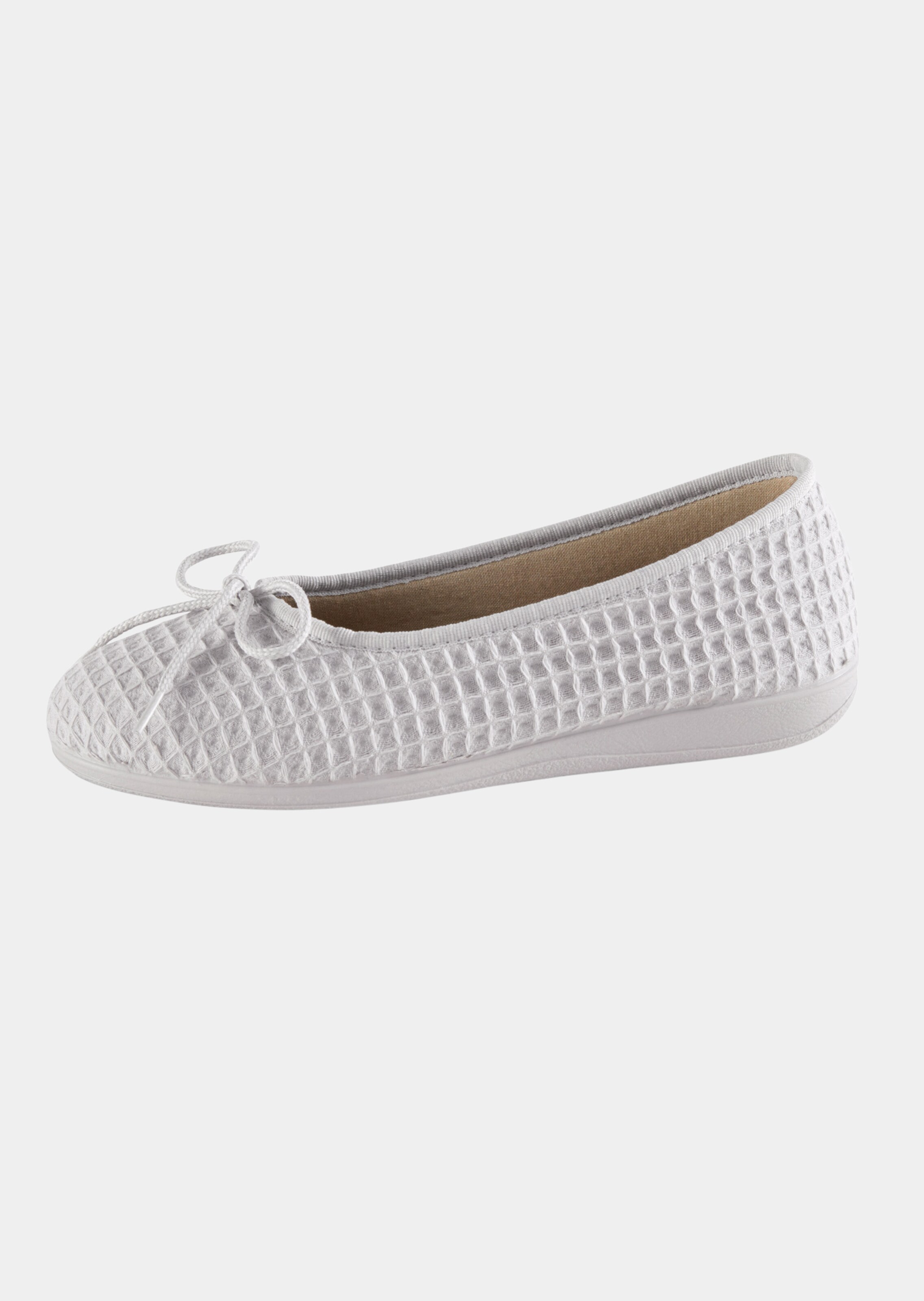 Hausschuhe in F-Weite, die dank der Ballerina-Form einen schlanken Fuß zaubern. Obermaterial, Futter und Decksohle bestehen aus reiner Baumwolle und sorgen für ein wohliges Fußklima. Das elegante Waffelmuster verleiht ihnen eine ansprechende Optik. Mit der rutschfesten Laufsohle aus echtem Kautschuk sind Sie auch zu Hause sicher unterwegs.