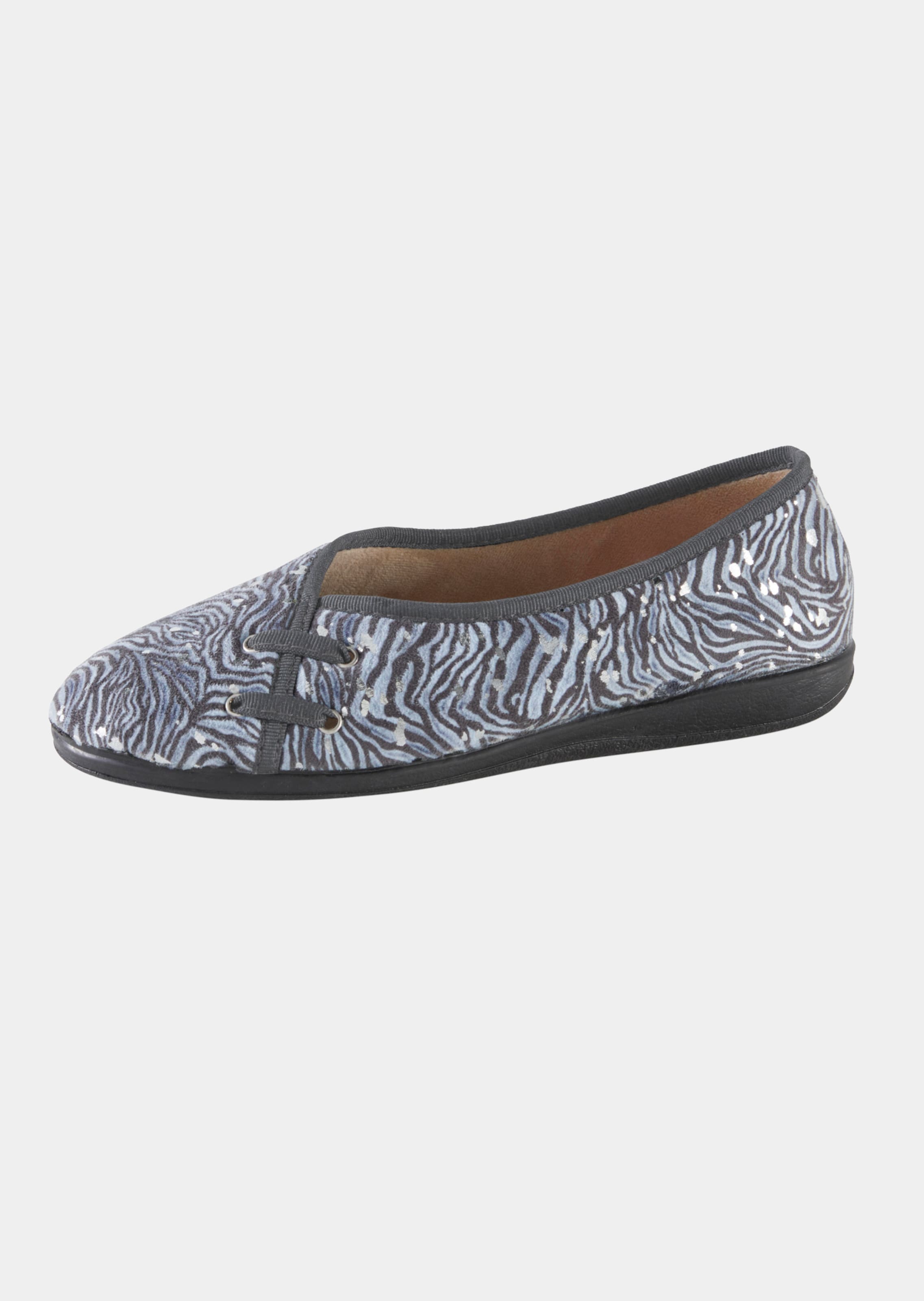 Hausschuhe in F-Weite im charakteristischen Animal Print – ein Muss für modebewusste Frauen, die auch zu Hause Stilbewusstsein zeigen wollen! Besonders schick sind die Schnüroptik und die metallischen Glanzdetails, die das Zebra-Dessin zieren. In femininer Ballerinaform, die sich schlanken Füßen optimal anpasst. Aus Textil, mit rutschsicherer Laufsohle aus Kautschuk.