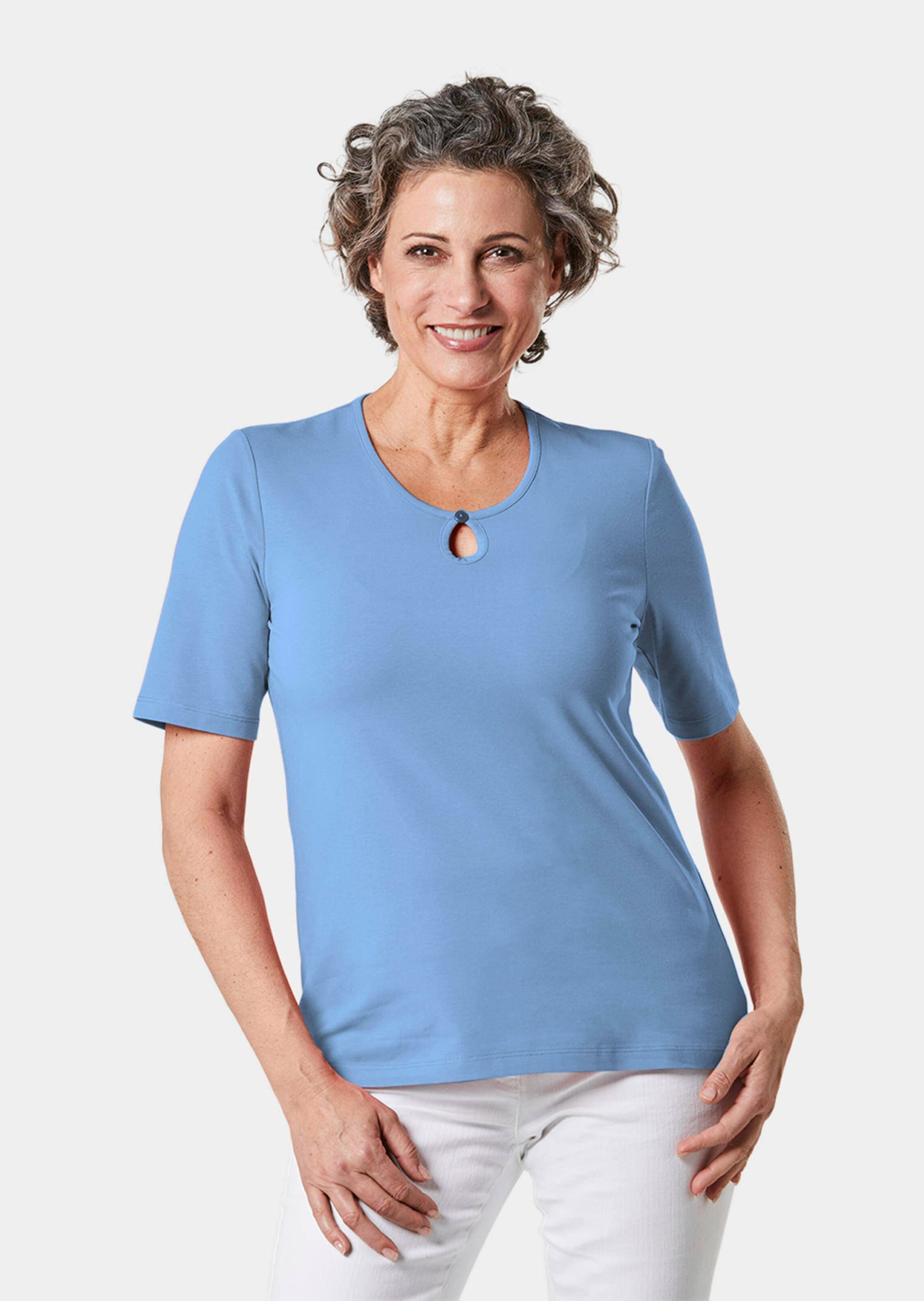 Shirt in traumhaft schöner Qualität aus reiner Baumwolle. Das zauberhafte Basic-Shirt ist ein wahrer Alleskönner und in jeder Farbe gut kombinierbar. Der kleine Tropfenausschnitt mit Zierknopf ist hübsches Detail. Mit sommerlichem Halbarm gearbeitet. Länge ca. 64 cm in Gr. 46, ca. 60 cm in Gr. 23.
