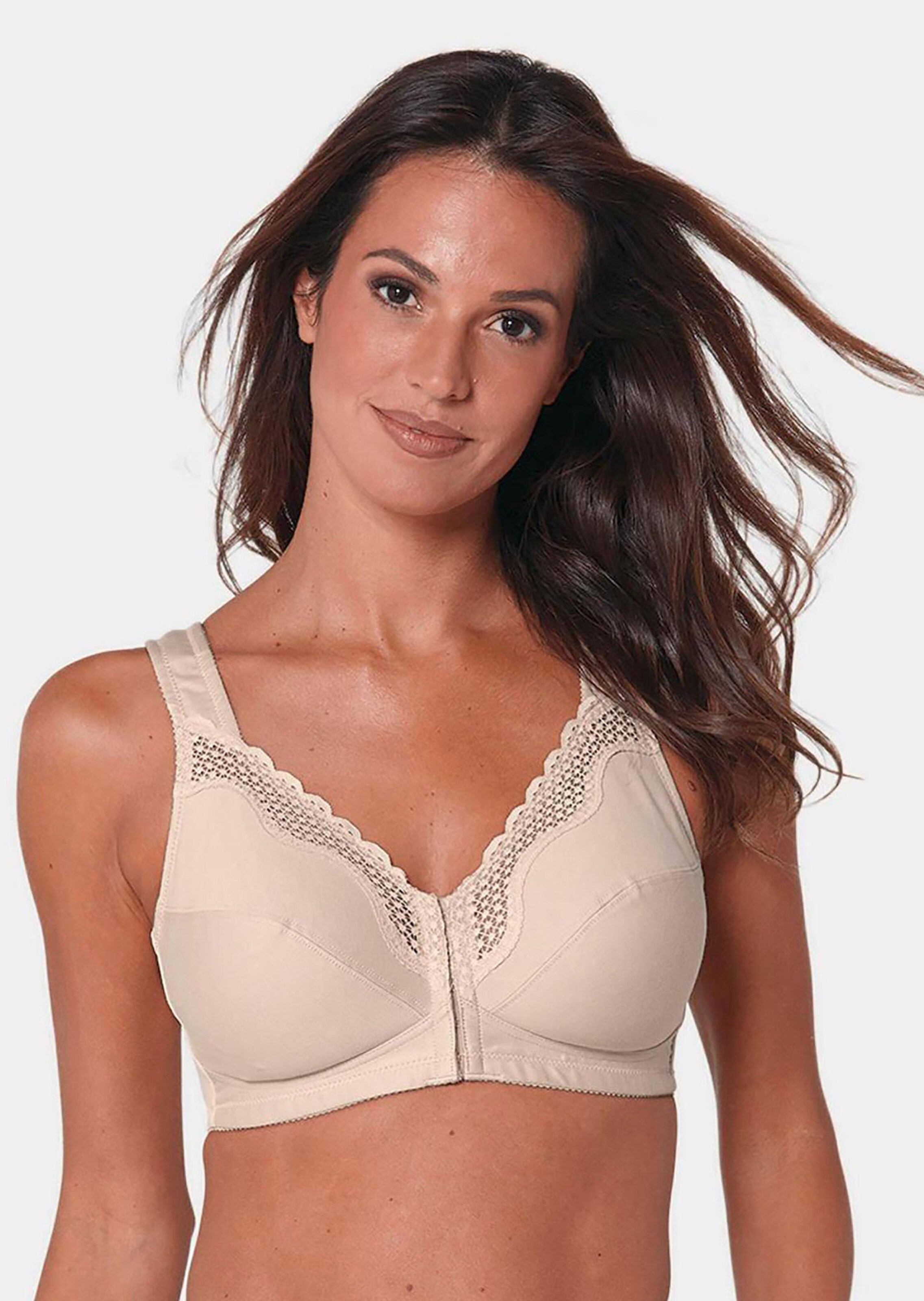BH mit Vorderverschluss für leichtes An- und Ausziehen. Dekorative Spitze in zarter Häkeloptik am Dekolleté ist ein charmanter Blickfang. Die Cups aus reiner Baumwolle sind bequem und atmungsaktiv. Funktionale Details sind die breiten Komfortträger, die komfortable Rückengestaltung in Überkreuz-Verarbeitung und die verstärkte Rückseite mit Powernet für eine aufrechte Schulterpartie und einen gestützten Rücken.