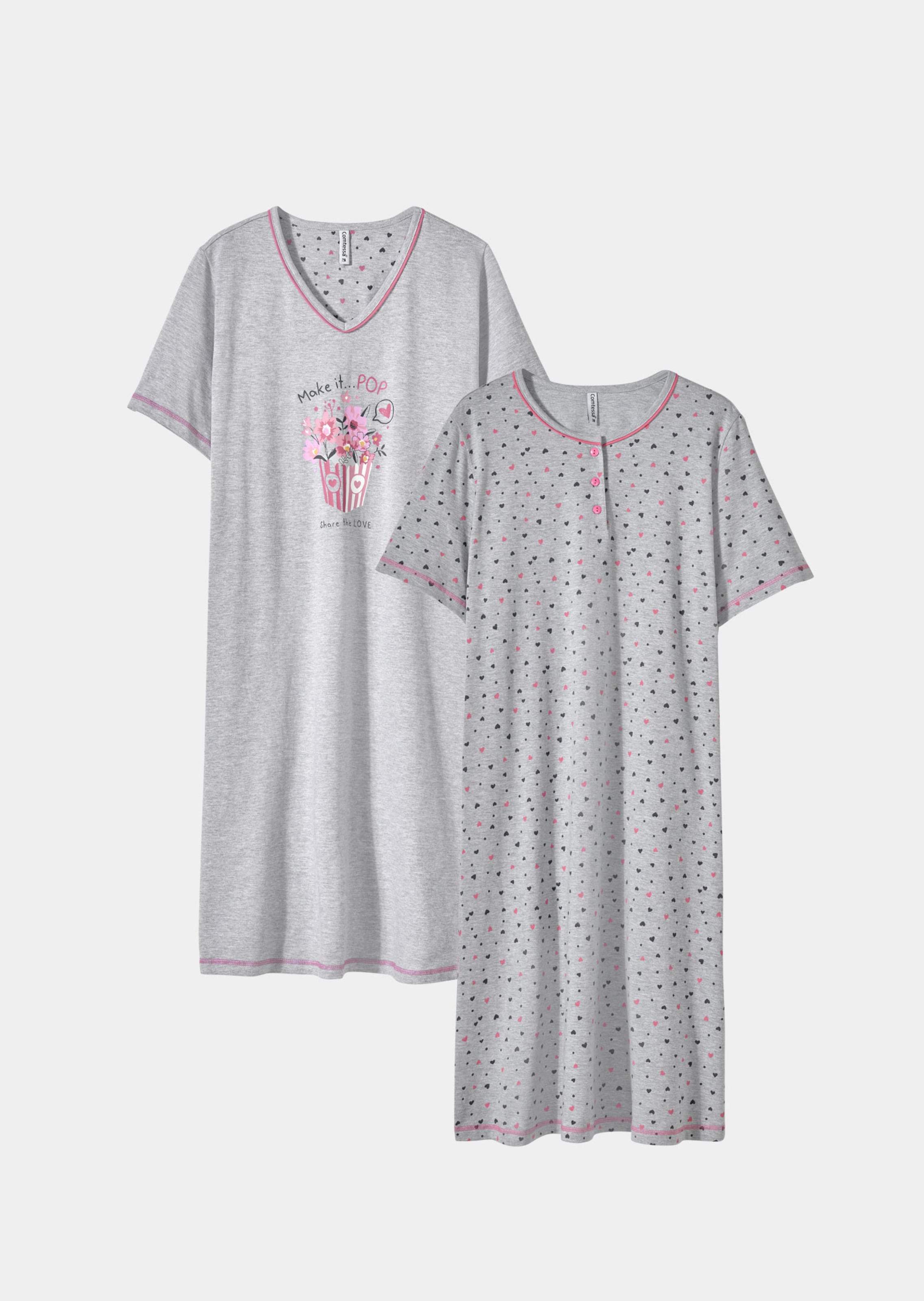 Nachthemden im 2er-Pack von COMTESSA: Sie erhalten ein gemustertes Modell mit Rundhalsauschnitt und Knopfleiste sowie ein unifarbenes Modell mit Frontmotiv und V-Ausschnitt. Beide mit Halbarm, in bequemer Passform. Aus wunderbar weichem Baumwoll-Jersey – anschmiegsam und atmungsaktiv.