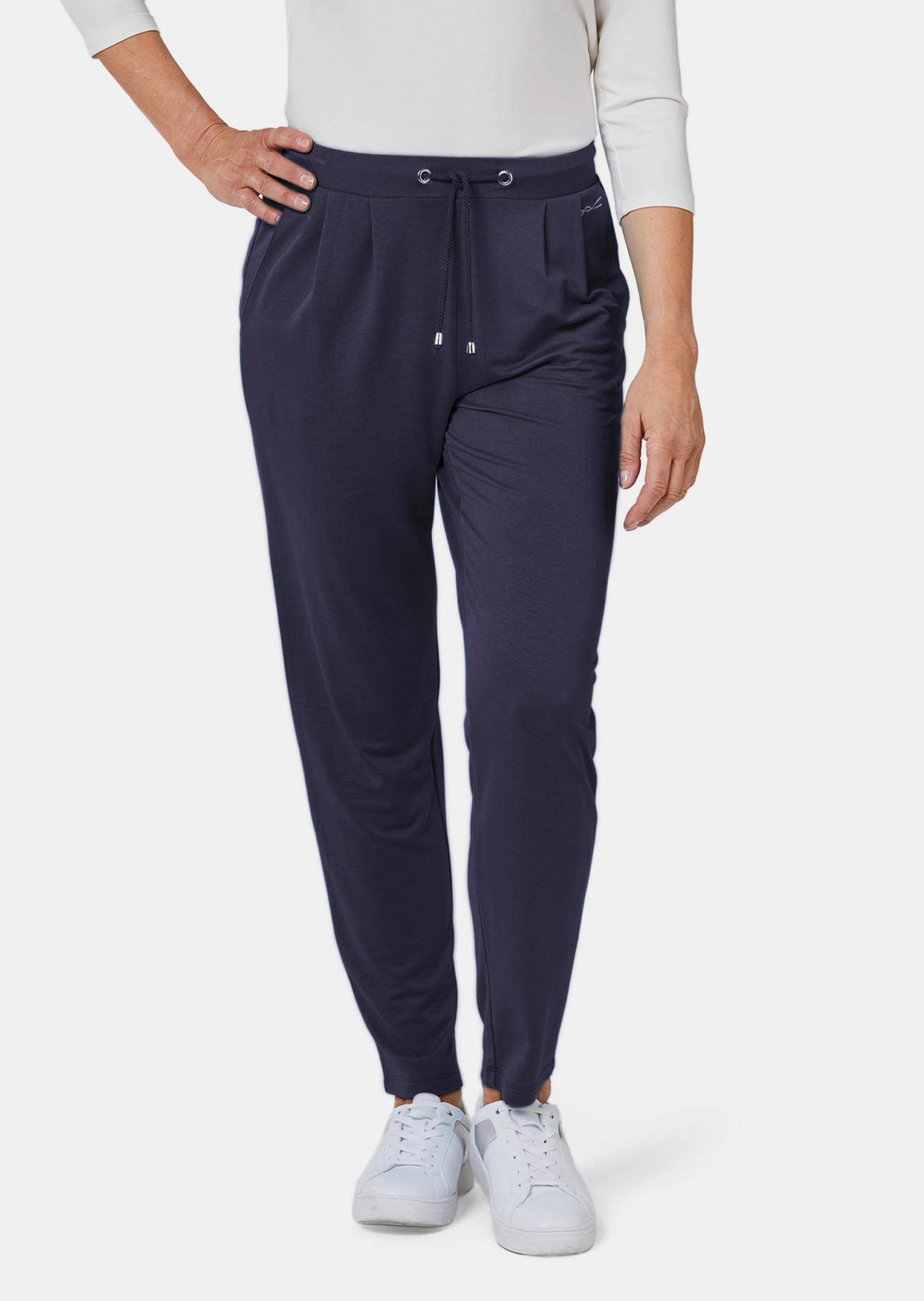 Schlupfhose, die sehr angenehm zu tragen ist und durch die Bundfalten eine Prise Chic erhält. Der elastische Schlupfbund mit Kordelzug schmiegt sich angenehm an und macht das An- und Ausziehen zum Kinderspiel. Die hochwertige Viskose-Qualität ist supersoft im Griff und formstabil durch den Elasthananteil. Mit seitlichen Eingriffstaschen und kleinem, silberfarbenem Wellenmotiv unterhalb des Bunds.