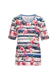 Druckshirt, das sich dank des farbharmonischen Dessin-Mix aus Blüten und Streifen perfekt kombinieren lässt. In stretchbequemer Qualität aus Viskose und Elasthan. Allover bedruckt und mit unifarbener Paspel am Rundhalsausschnitt sowie kurzen Ärmeln ein schöner Sommer-Begleiter. Länge ca. 64 cm in Gr. 46, ca. 60 cm in Gr. 23.