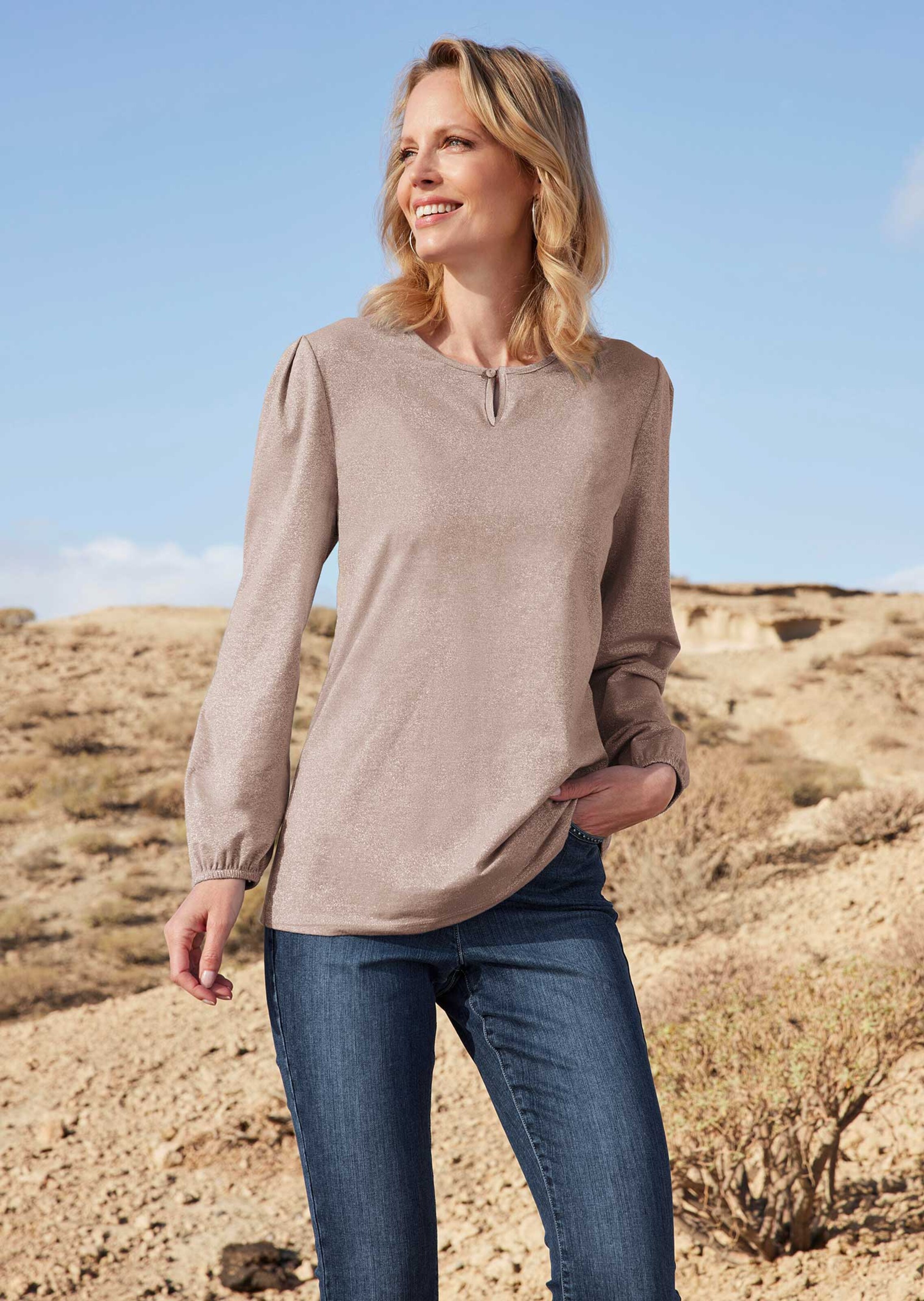Glanzshirt mit raffinierter Ausschnittlösung: Der Rundhals ist vorn mit einem Schlitz und Knopf gearbeitet und verleiht dem edel schimmernden Modell dadurch noch mehr femininen Charme. Der weite Ärmel wird durch kleine Falten an der Schulter und durch das Gummiband am Saum betont. Trageangenehme Ware mit Viskose und Elasthan. Länge ca. 66 cm in Gr. 46, ca. 62 cm in Gr. 23.