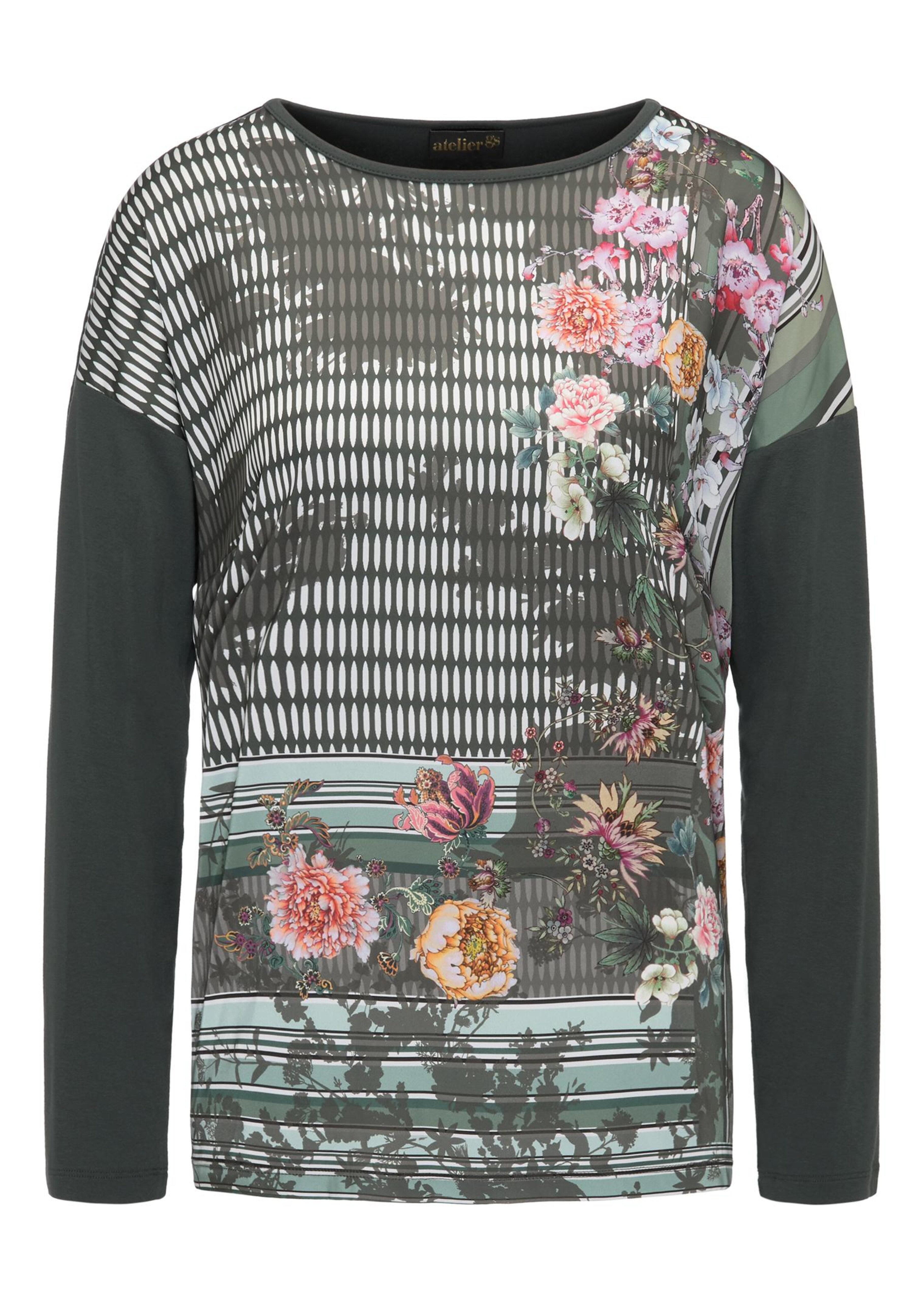 Blusenshirt mit bedruckter Webfront aus einer weich fließenden Satinware. Ärmel und Rückteil sind aus bequemer Jerseyqualität. Mit modisch überschnittenen Schultern, femininem U-Boot-Ausschnitt mit Paspelierung und Brustabnähern für gute Passform. Schöne, legere Schnittführung. Länge ca. 66 cm in Gr. 46, ca. 62 cm in Gr. 23.