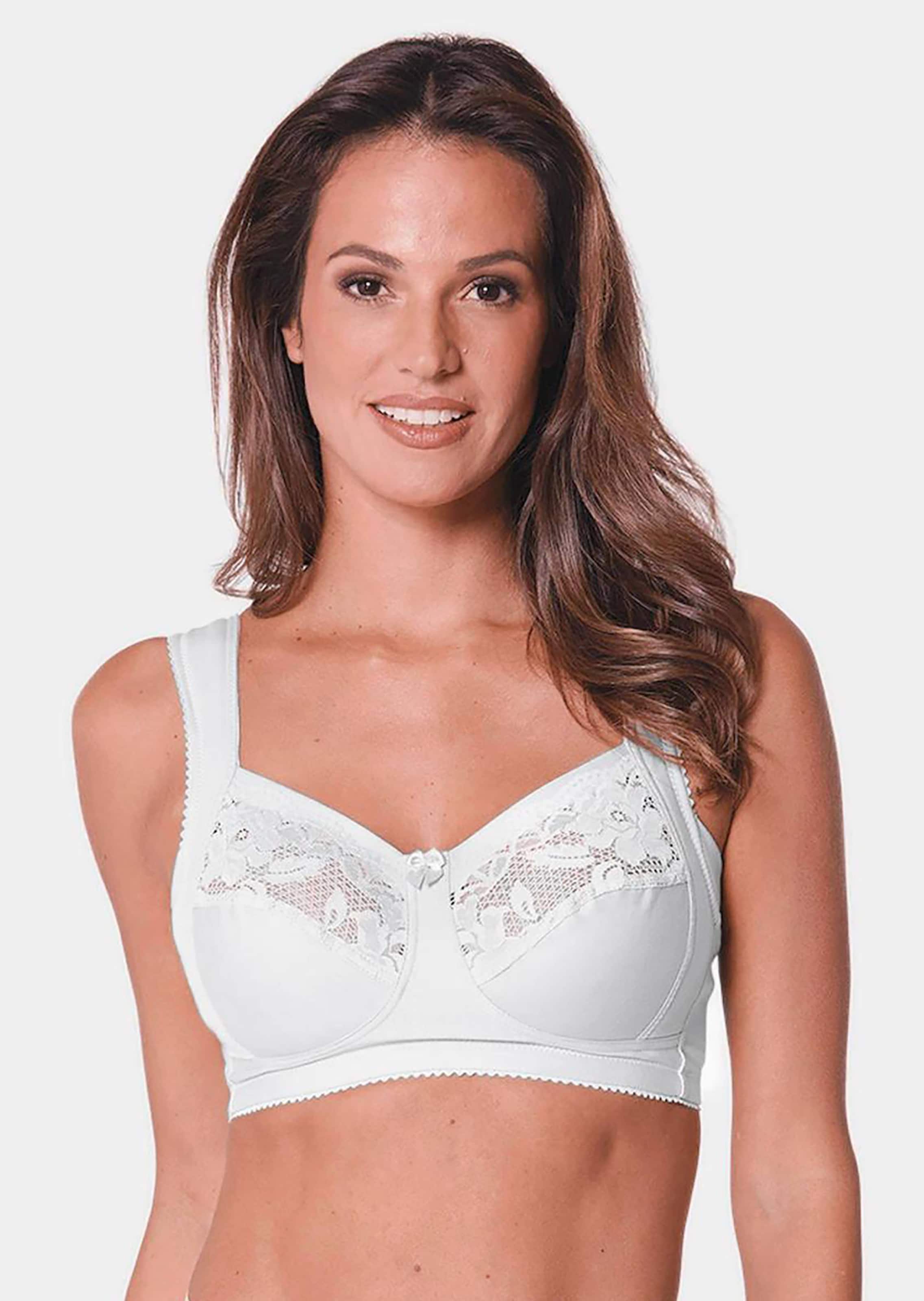 Bequemer BH. Mit viel weicher Baumwolle. Cups in Baumwolle mit schöner, elastischer Spitzenverzierung. Stützflügel am Armausschnitt erhöhen den Komfort. Wattierte Seitenstütze und breite, wattierte Komfortträger, hinten verstellbar. Rücken in bequemem elastischen Material mit Hakenverschluss.