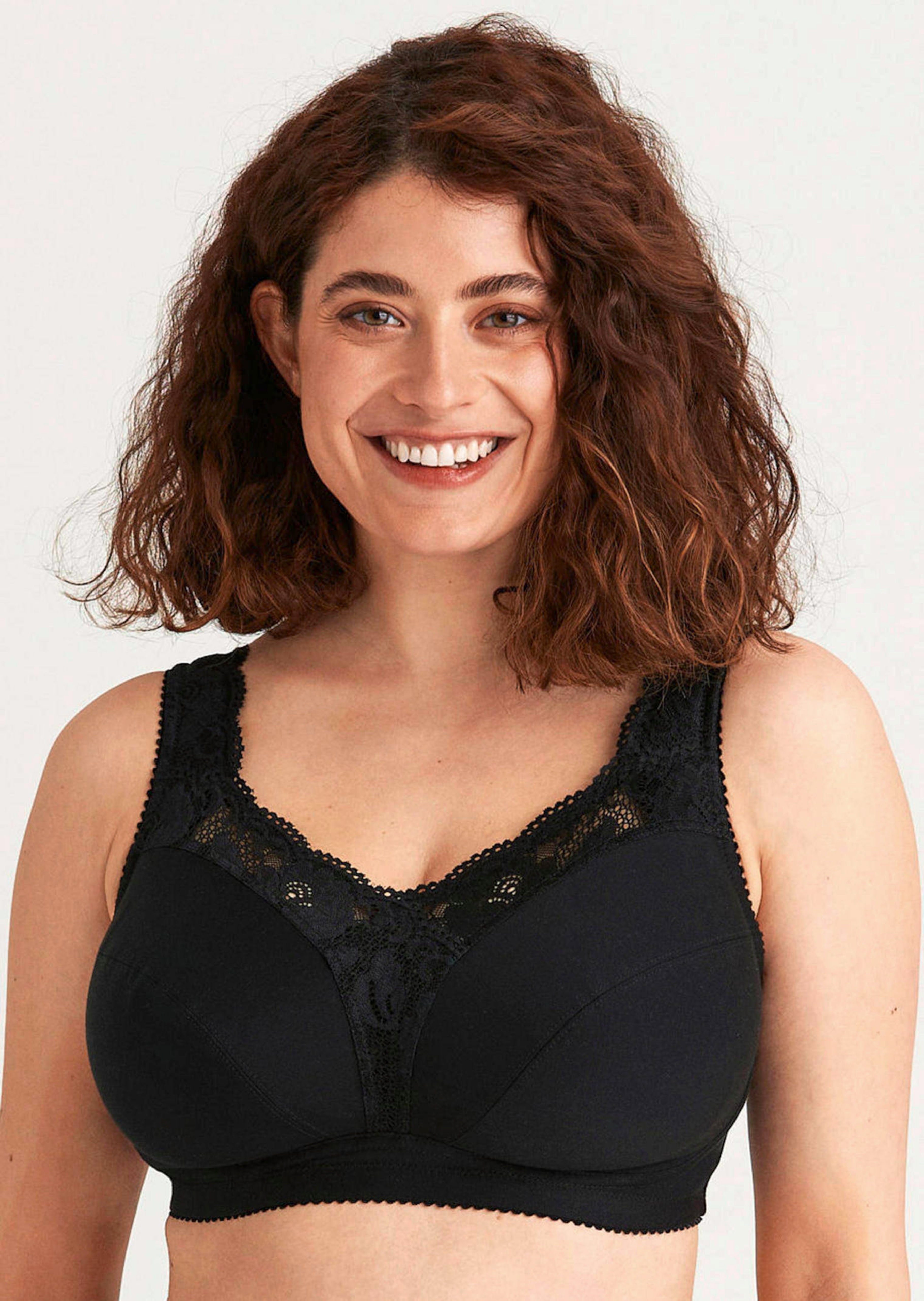 BH ohne Bügel von MISS MARY – die verstärkten Cups und das gefütterte Unterbrustband geben perfekten Halt. Dekorative Spitze an Dekolleté und Trägern, der Rücken ist U-förmig gearbeitet. Komfortträger und Hakenverschluss verstellbar. Weiche Qualität mit viel Baumwolle.
