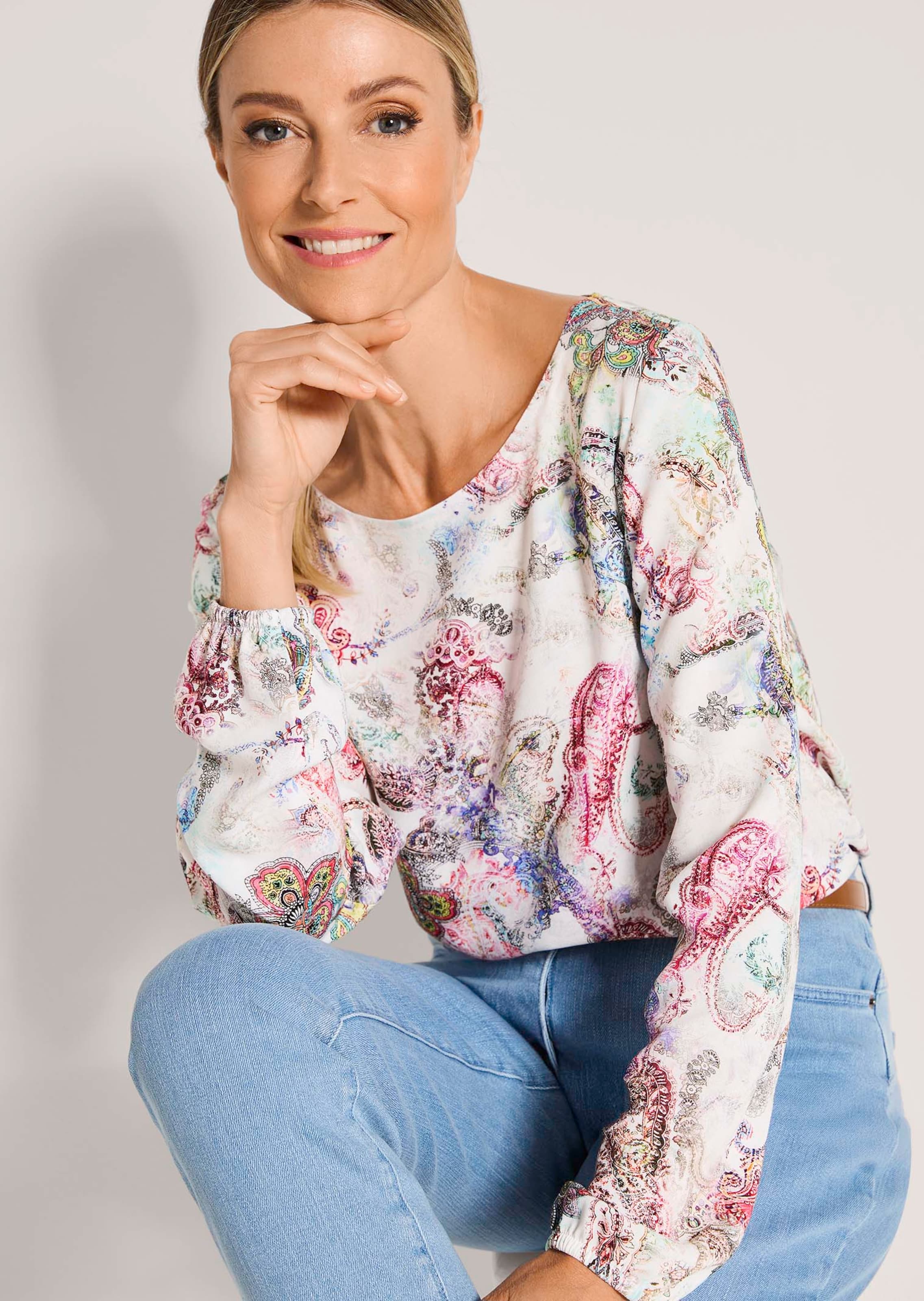 Bluse in verspieltem Fantasieprint, der in zarten Farben einen Hauch Romantik verleiht. Perfekt kombinierbar und variabel im Styling, denn die Ärmellänge lässt sich dank Gummibündchen individuell anpassen. Legere Passform mit Rundhalsausschnitt. Aus reiner Viskose. Länge ca. 67 cm in Gr. 46, ca. 63 cm in Gr. 23.