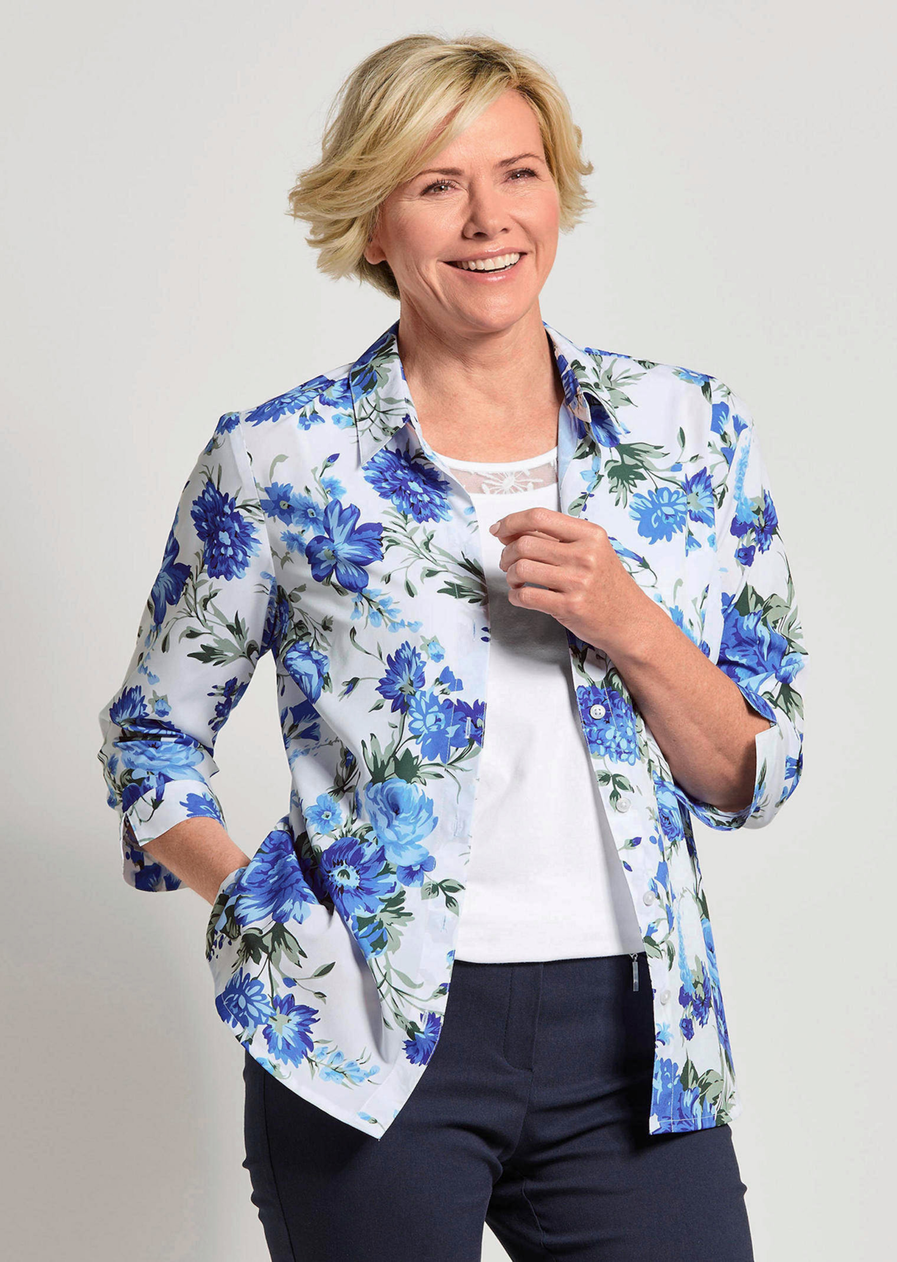 Blusen-Set, bestehend aus Bluse und Top: Zusammen eine harmonische Kombination, aber auch solo getragen ein Hingucker! Bluse mit Hemdkragen und Knopfleiste, 3/4-Arm mit Aufschlag und Schlitz. Top aus hautschmeichelndem Baumwoll-Jersey mit breiten Trägern. Der florale Print der Bluse und der Spitzeneinsatz des Tops ergänzen sich perfekt! Länge Bluse/Top ca. 69/67 cm in Gr. 46, ca. 65/63 cm in Gr. 23.