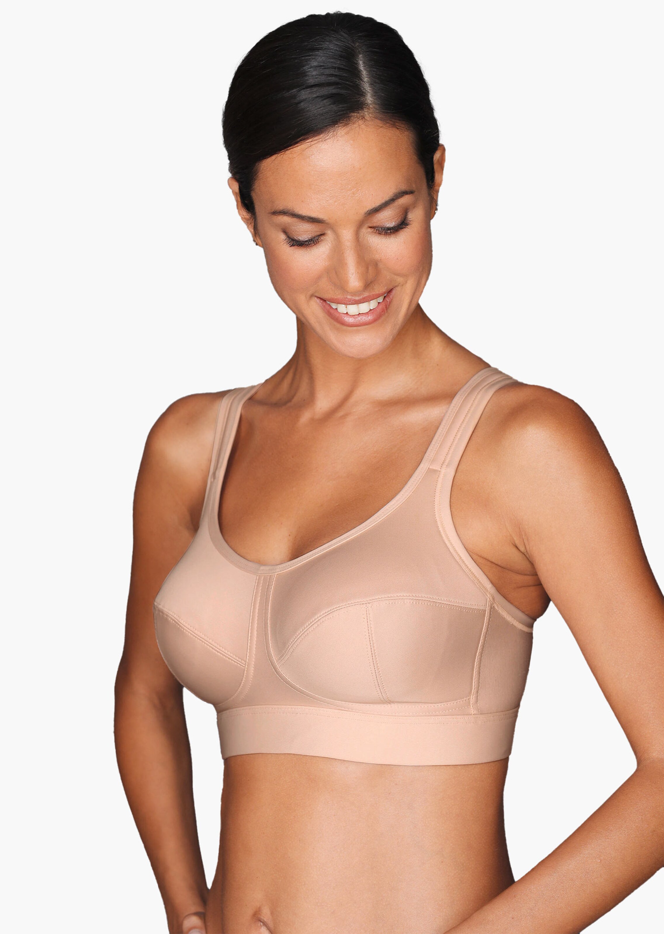 Sport-BH ohne Bügel. Mit weichem, extrabreitem Unterbrustband und breiten, weich gepolsterten Trägern für hohen Tragekomfort. Genähte 3-teilige Cups geben eine gute Passform und zusätzlichen Halt. Die erhöhte Vordernaht in der Mitte, sowie die höher geschnittenen Seiten sorgen für perfekten Sitz. Damit bei Aktivität nichts verrutscht, können die Träger im Rücken zum Kreuz fixiert werden. Extra gepolsterte Stütze auf der Innenseite der Cups sowie weiche Innen-Paspelierungen.