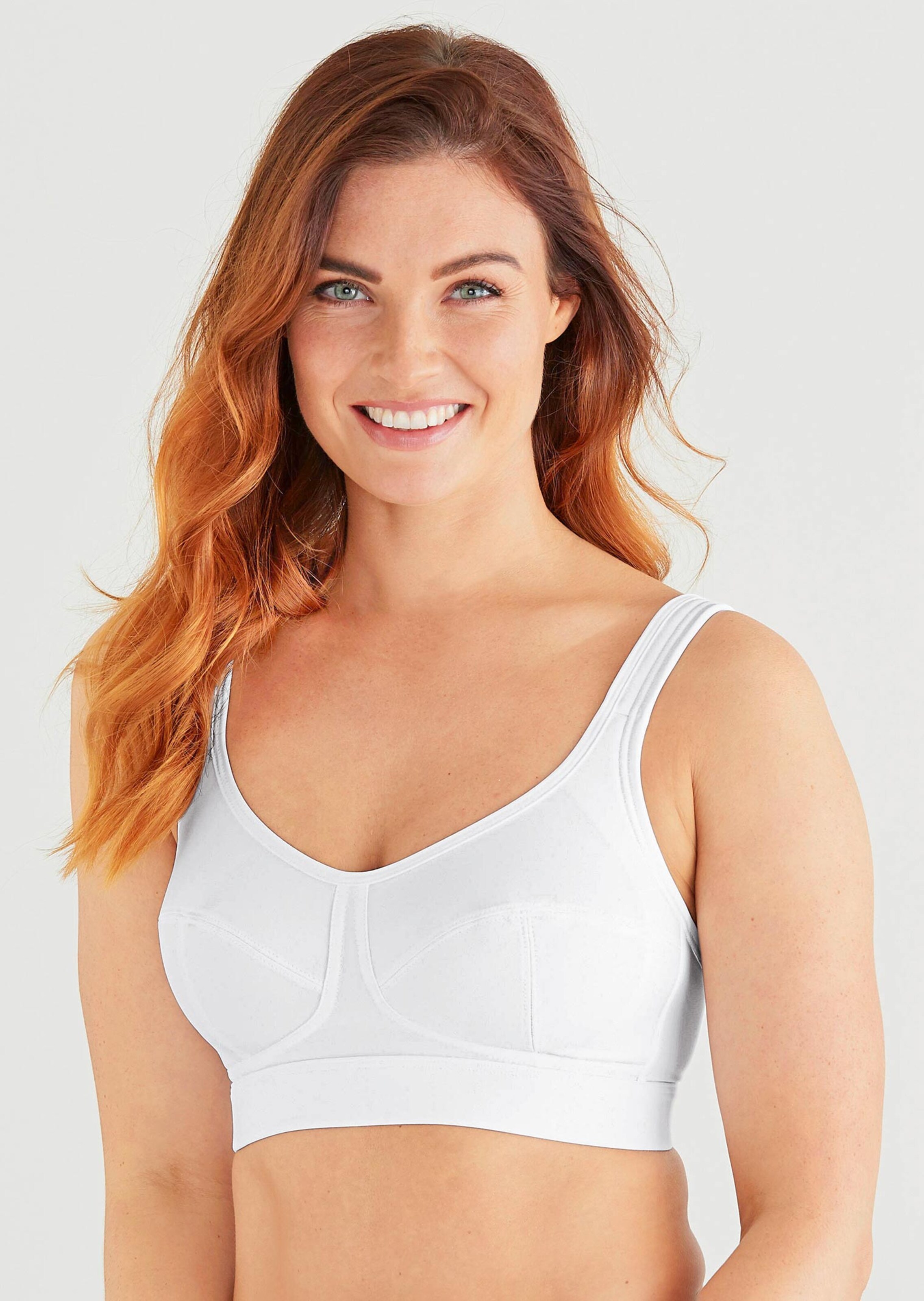 Sport-BH ohne Bügel. Mit weichem, extrabreitem Unterbrustband und breiten, weich gepolsterten Trägern für hohen Tragekomfort. Genähte 3-teilige Cups geben eine gute Passform und zusätzlichen Halt. Die erhöhte Vordernaht in der Mitte, sowie die höher geschnittenen Seiten sorgen für perfekten Sitz. Damit bei Aktivität nichts verrutscht, können die Träger im Rücken zum Kreuz fixiert werden. Extra gepolsterte Stütze auf der Innenseite der Cups sowie weiche Innen-Paspelierungen.