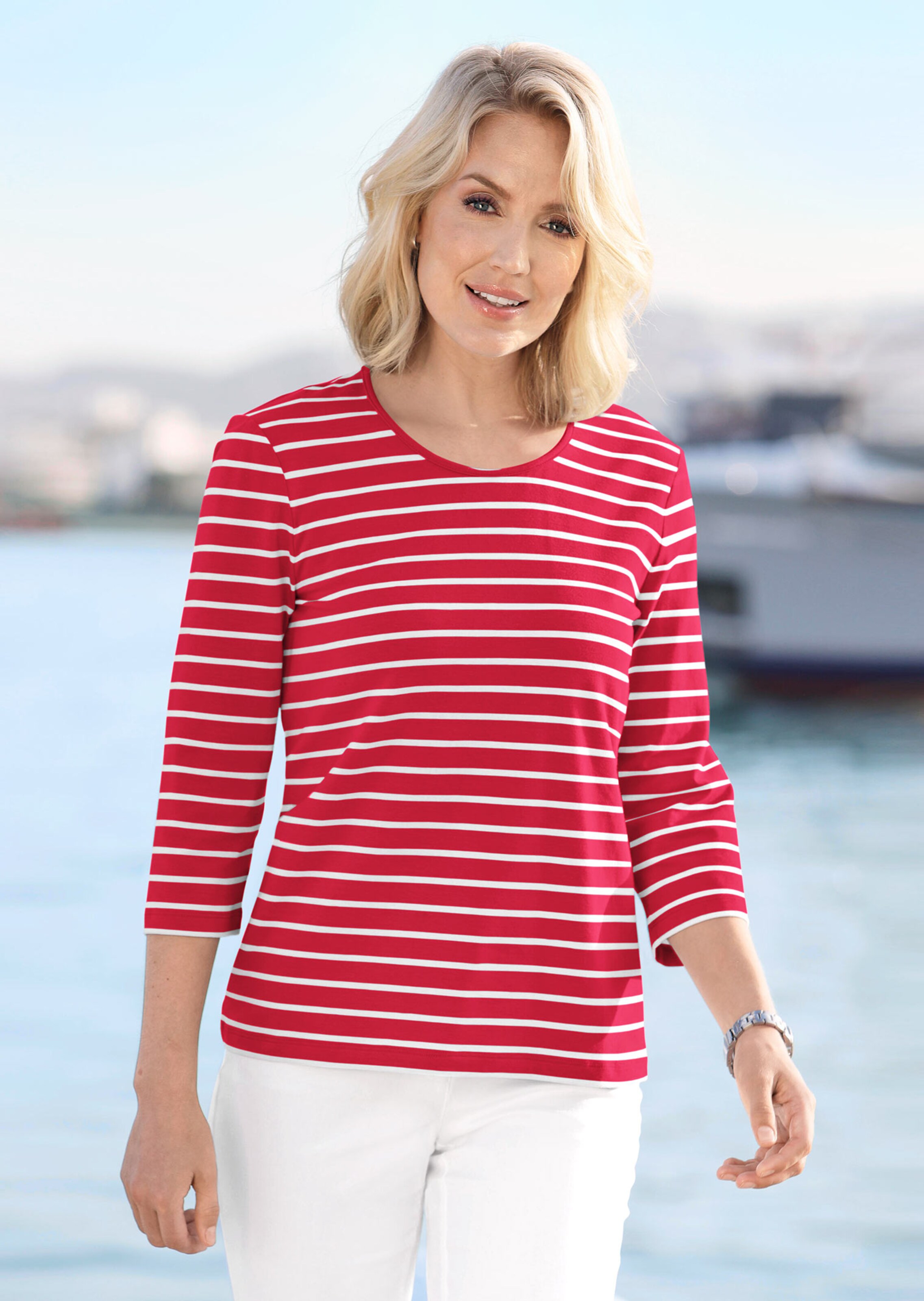 Ringelshirt im maritimen Chic. Die Ringel sind garngefärbt und behalten dadurch auch nach häufigem Waschen lange ihre Farbe. Die formstabile Baumwoll-Elasthan-Qualität erzeugt ein schönes, ebenmäßiges Warenbild und sorgt für höchsten Tragekomfort mit optimaler Bewegungsfreiheit. Ausgestattet mit 3/4-langen Ärmeln und Rundhalsausschnitt. Ein unerlässliches Basisstück zum außergewöhnlichen Preis. Länge ca. 66 cm in Gr. 46, ca. 62 cm in Gr. 23.