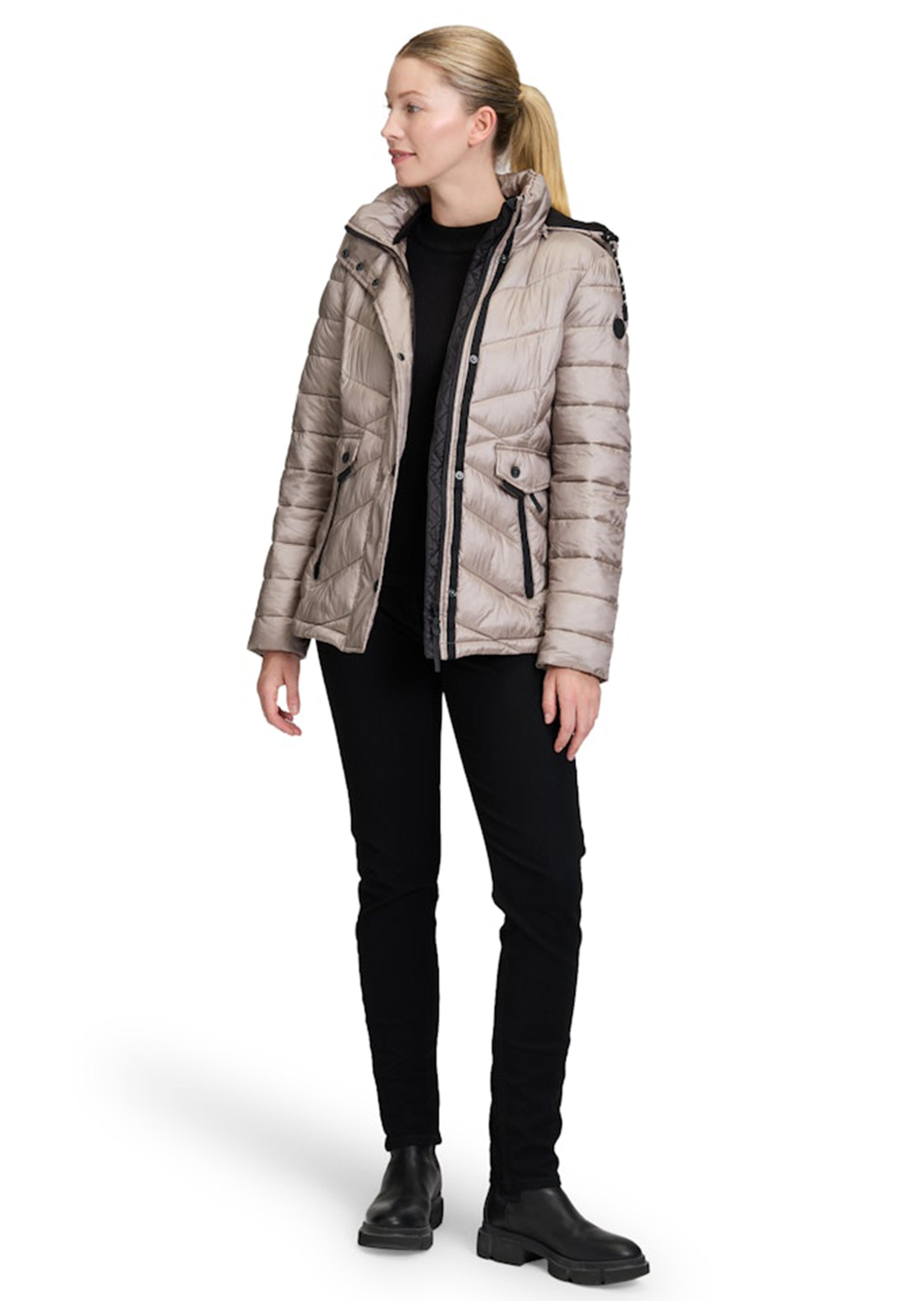 Steppjacke mit Kapuze von GIL BRET mit formgebenden Teilungsnähten. Die sportive Steppung schimmert ansprechend und macht das Modell zum Blickfang. Dank einem Zugband im Rückteil lässt sich die Jacke individuell taillieren. Die abnehmbare Kapuze mit Jerseyfutter ist am unteren Rand des Stehkragens befestigt, so dringt keine Kälte an den Hals. Ein kontrastfarbenes Ripsband stärkt die Druckknopfleiste, die den Reißverschluss verdeckt. Mit Jersey-Bündchen am Ärmelsaum und seitlichen Reißverschlusstaschen mit Dekopatten. Auch die Futterinnentasche lässt sich mit Reißverschluss verschließen. Ein echtes Lieblingsmodell, das dank hochwertiger Kunstdaunenfüllung auch im Winter wohlige Wärme schenkt! Länge ca. 72 cm in Gr. 46.