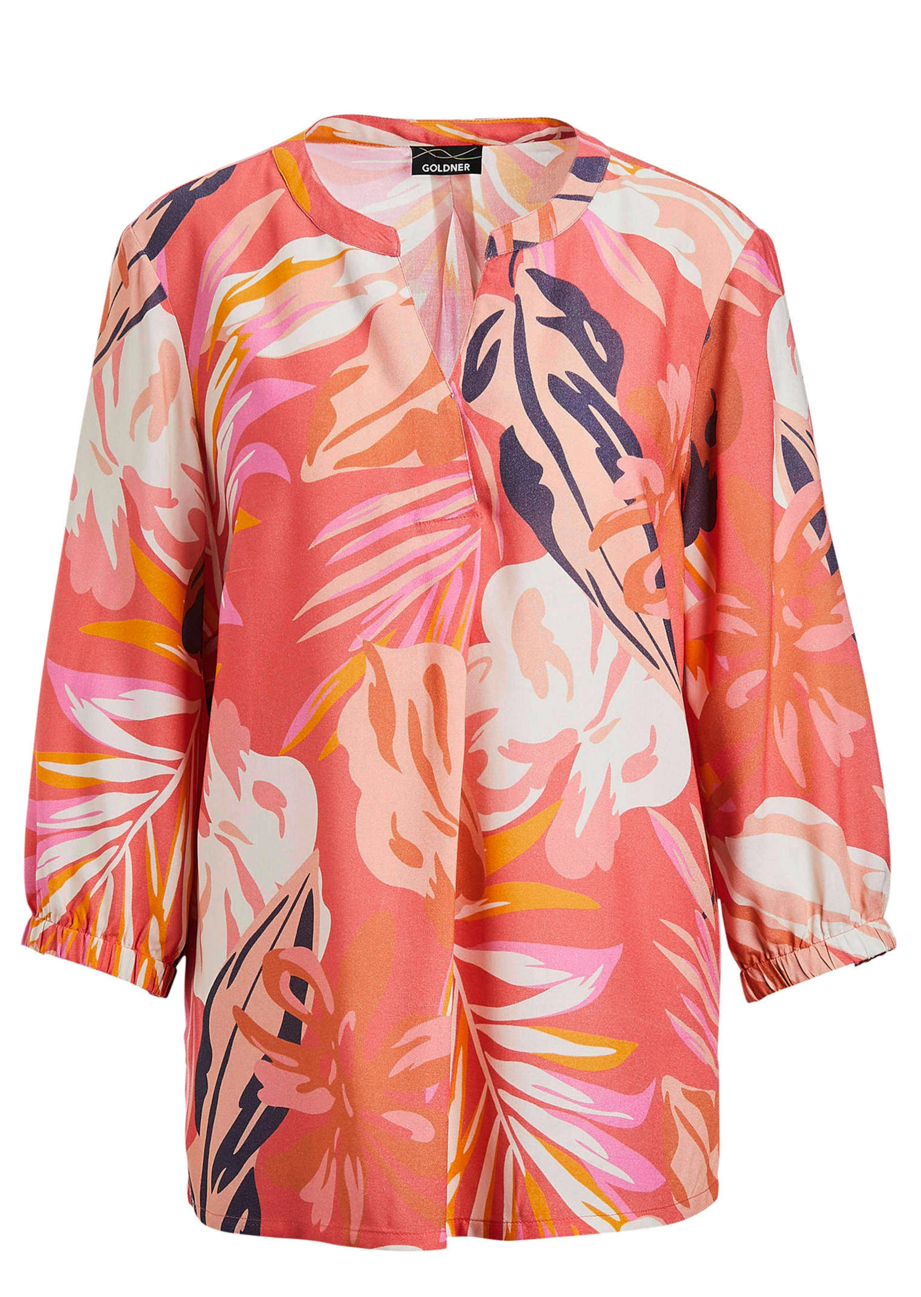 Druckbluse in sommerlichem Blätter- und Palmenmuster – da kommt Urlaubsstimmung auf! Aus hautsympathischer Viskose trägt sie sich angenehm leicht. Der Rundhalsausschnitt mit Blende geht in ein streckendes V über, ein Druckknopf verhindert ungewollte Einsichten. Die Bluse springt dank einer Falte im Vorder- und Rückteil schön auf und bietet luftige Mehrweite. 3/4-lange Ärmel mit Gummibund zum Hochschoppen runden das Modell ab. Länge ca. 69 cm in Gr. 46, ca. 65 cm in Gr. 23.