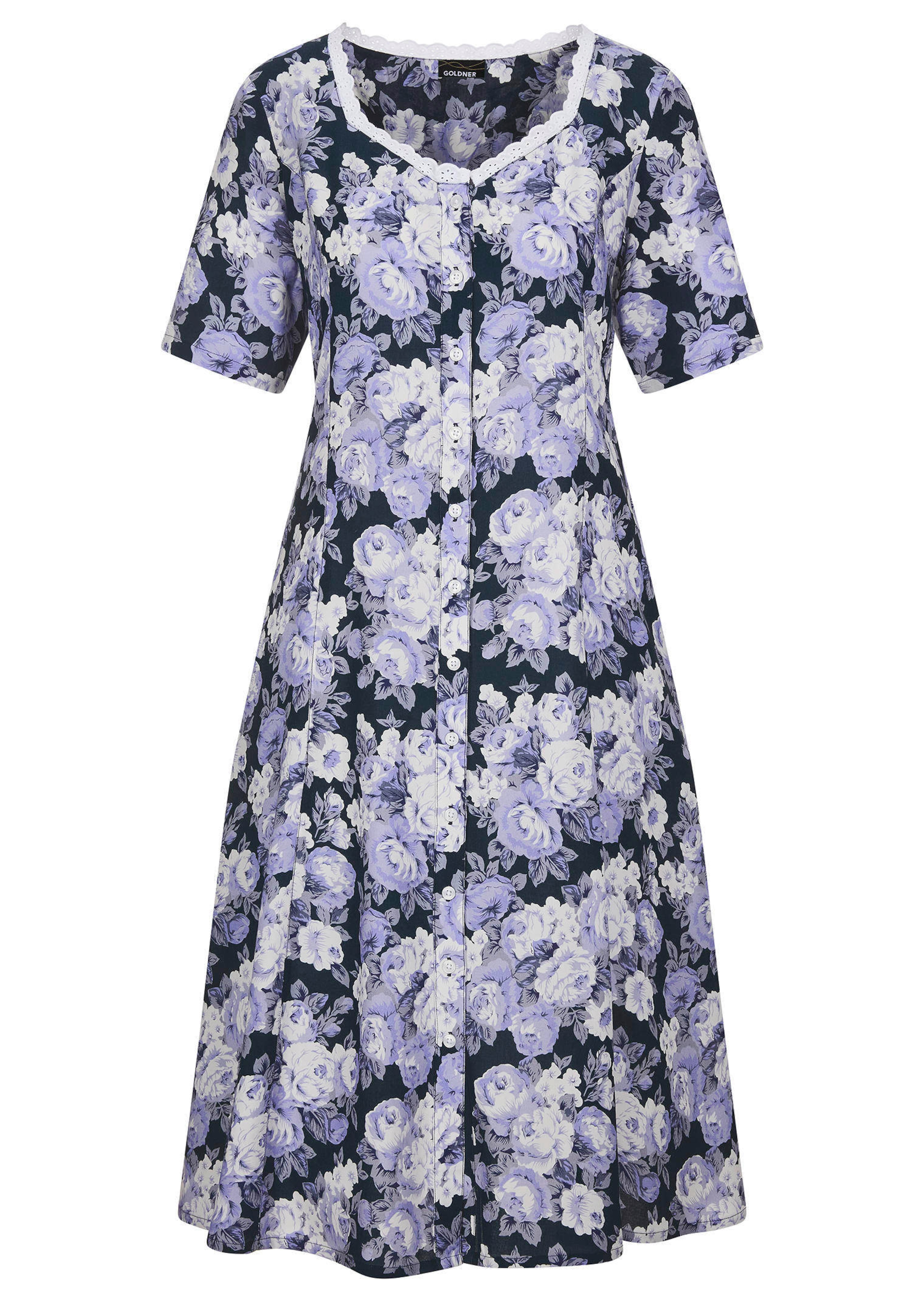 Druckkleid in zartem Blumenmuster. Die hübsche Spitze am Trapez-Ausschnitt unterstreicht die feminine Note. Die figurschmeichelnde Passform mit Wiener Nähten betont die Büste, die leicht ausgestellten Rockbahnen schwingen bei jedem Schritt mit. Mit durchgeknöpfter Knopfleiste, Halbarm und praktischen Seitentaschen. Dank reiner Viskose trägt sich das Kleid besonders leicht und angenehm an warmen Tagen. Länge ca. 112 cm in Gr. 46, ca. 106 cm in Gr. 23.