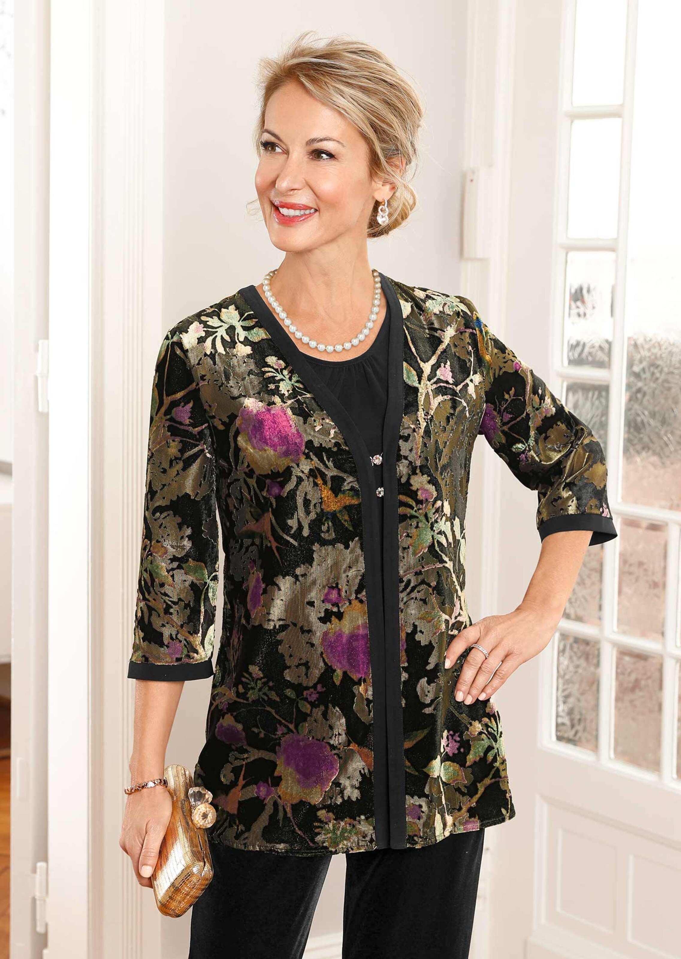 Samtausbrenner-Jacke, die eleganter kaum sein könnte: Goldglänzende Garne veredeln ihre Optik und versprühen luxuriösen Charme. In figurschmeichelnder A-Linie mit 3/4-langen Ärmeln und zwei Hakenverschlüssen mit Glitzersteinen. Die semitransparente, leichte Samtausbrennerware schenkt ein hervorragendes Tragegefühl. Länge ca. 73 cm in Gr. 46, ca. 69 cm in Gr. 23.