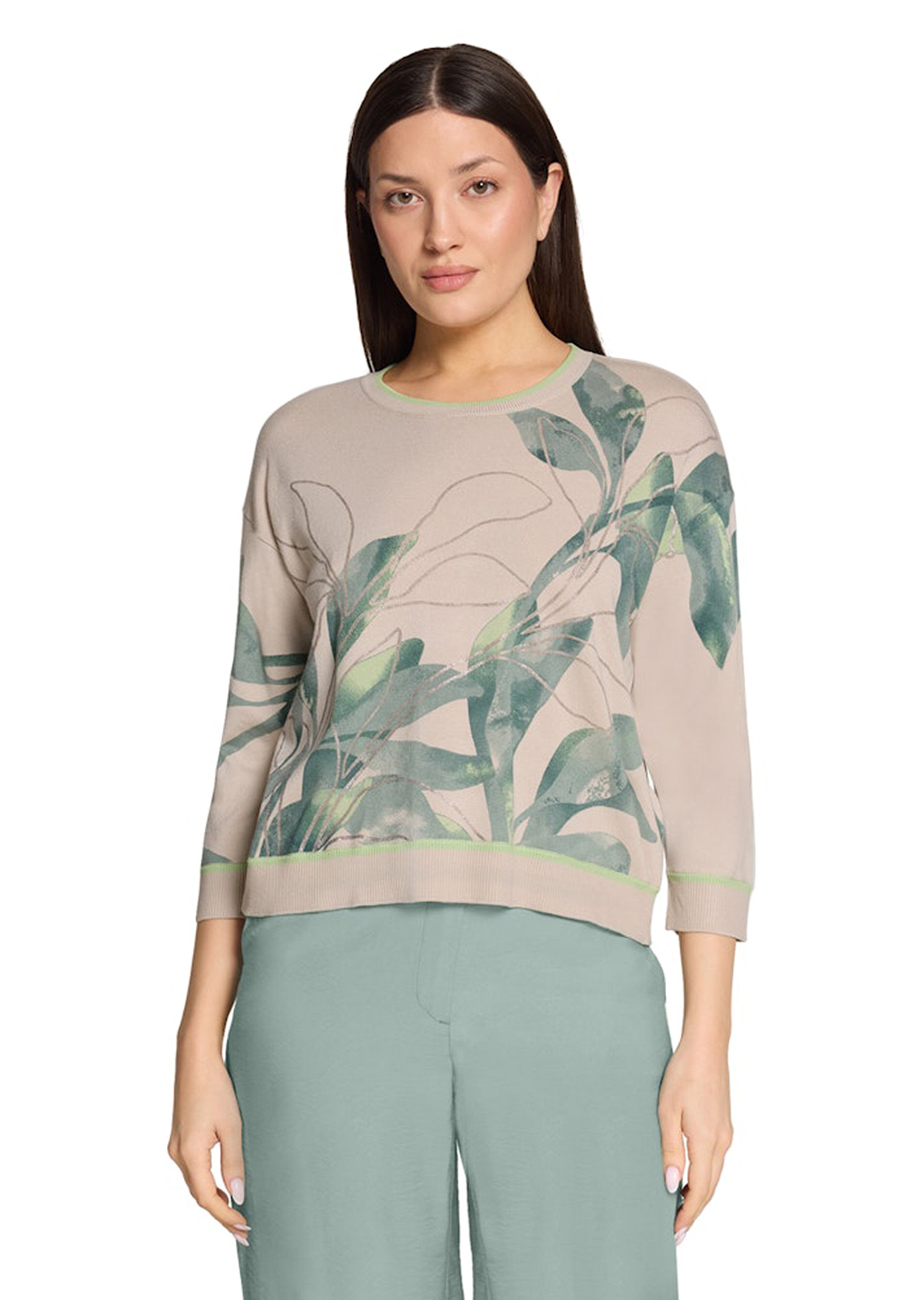 Feinstrickpullover von BETTY BARCLAY mit großflächigem Blätterprint und silberfarbenem Glanzdruck – so sieht edler Alltags-Chic aus! Die leichte Viskosemischung trägt sich wunderbar weich, die gerade Passform mit überschnittenem 3/4-Arm und U-Boot-Ausschnitt umspielt angenehm die Figur. Blickfang sind die zweifarbigen Abschlüsse an Ausschnitt, Arm und Saum, die geschickt die Farbigkeit des Musters aufgreifen. Länge ca. 64 cm in Gr. 46.