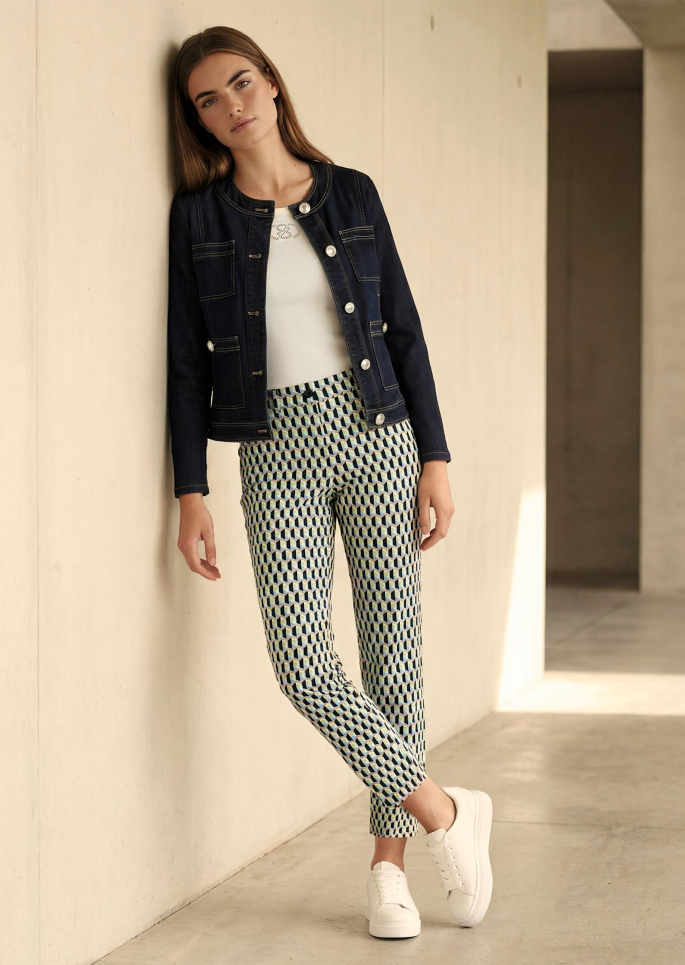 Jeansjacke von BETTY BARCLAY in kragenloser Form mit Rundhalsausschnitt – ein frisches Update zum klassischen Denim-Look. Kontraststepp und dekorative Knöpfe ziehen die Blicke auf sich. Teilungsnähte garantieren eine perfekte Passform, während die elastische Baumwollmischung für Tragekomfort sorgt. Aufgesetzte Pattentaschen im Vorderteil und lange Ärmel mit Knöpfen runden das Modell gekonnt ab. Länge ca. 64 cm in Gr. 46.
