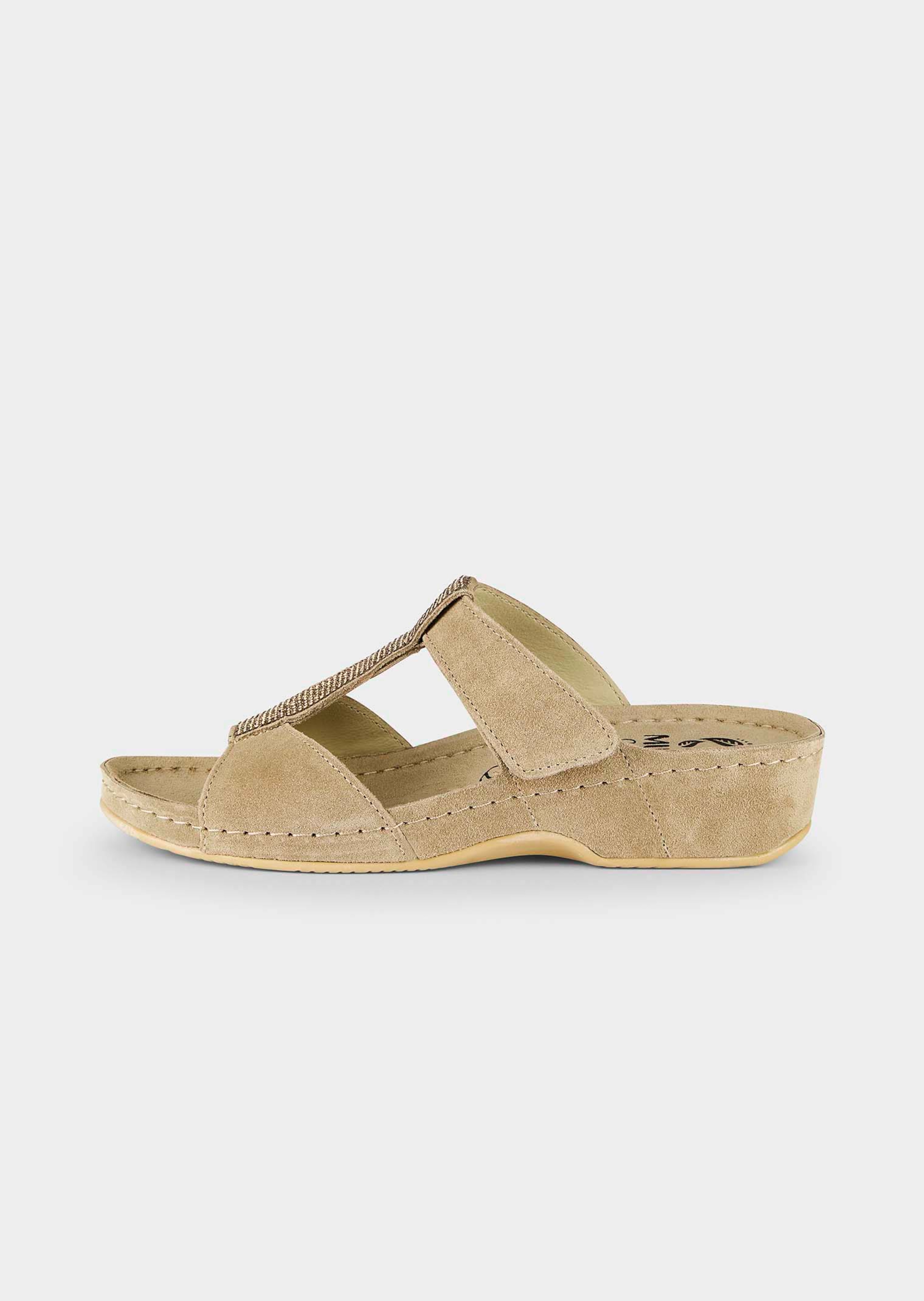 Pantoletten von MUBB aus echtem Leder. Das Memory-Fußbett schmiegt sich dem Fuß ergonomisch an und bettet ihn weich und komfortabel. Ein Klettverschluss erleichtert das An- und Ausziehen. Die besonders flexible PU-Laufsohle mit rutschhemmenden TR-Einlagen bietet ein wunderbares Gehgefühl bei sicherem Halt. Hübsche Glitzersteinchen veredeln das Modell.