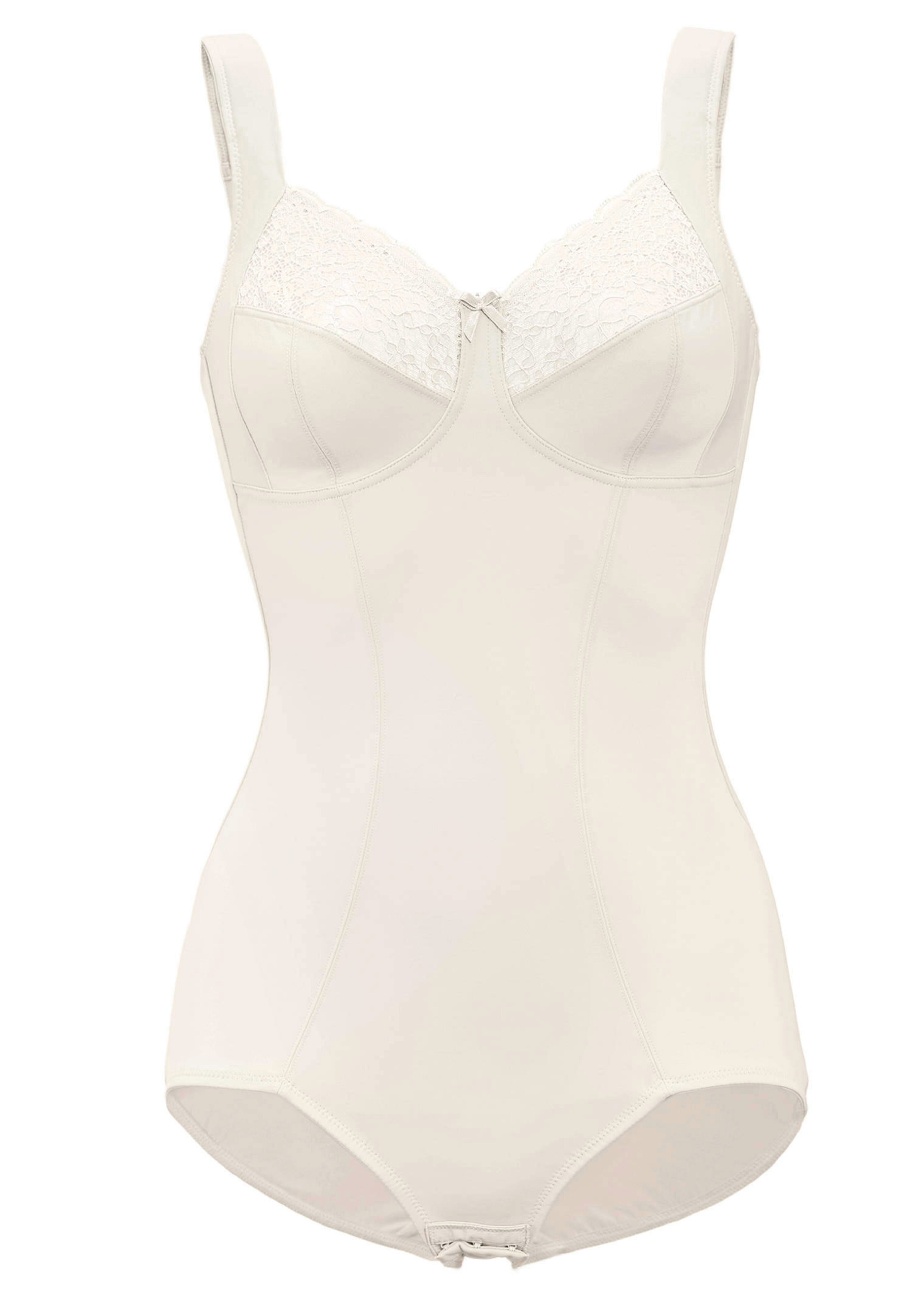 Body von ANITA. Elastische Spitze in den oberen Cuphälften. Rücken und Vorderteil aus Elastikware. Breite, weich wattierte Entlastungsträger, hinten verstellbar. Schritt mit Baumwolle gefüttert.