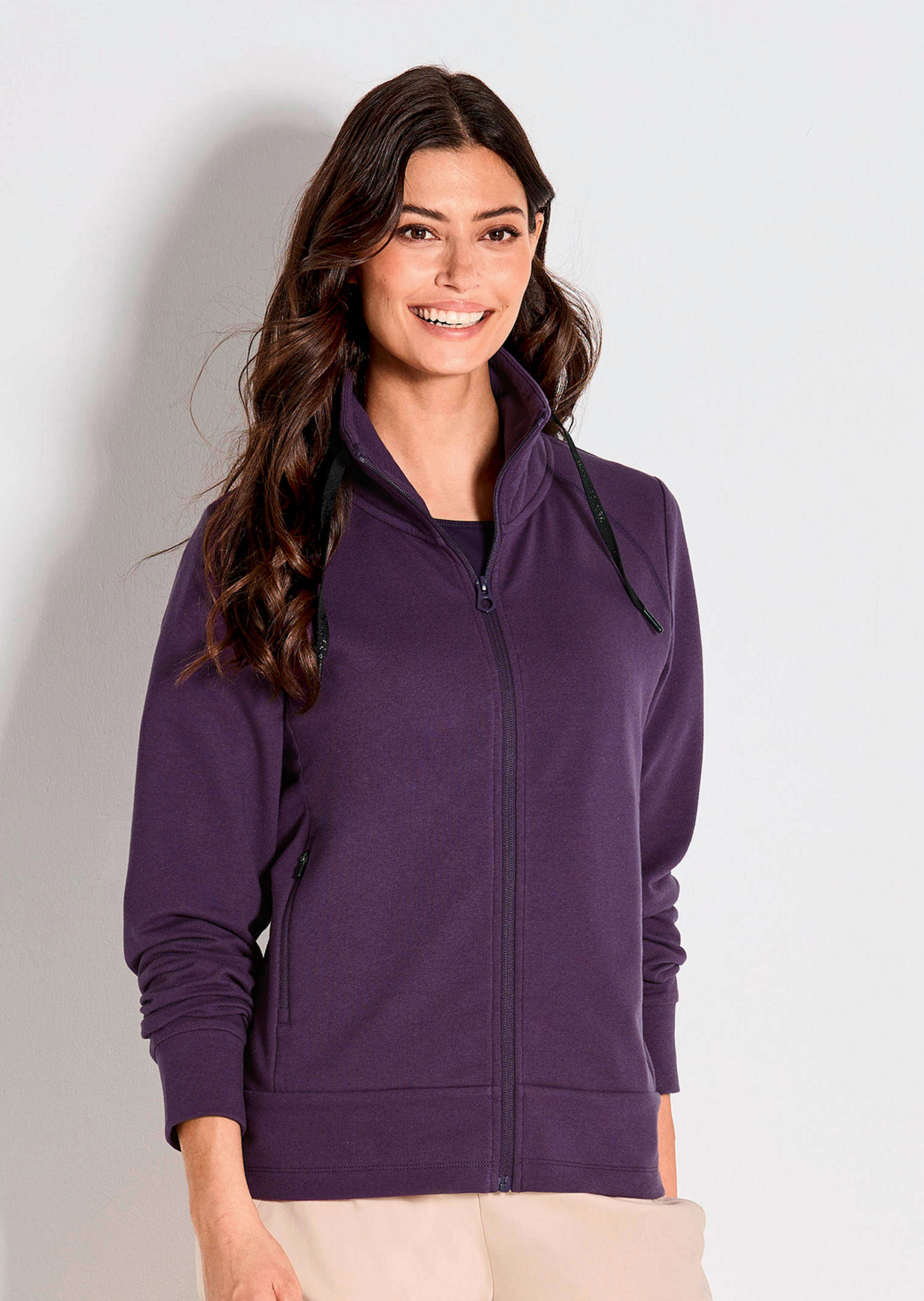 Freizeitjacke von VENICE BEACH in extra leichter Sweatqualität. Ein stylischer Stehkragen mit Bindeband, Teilungsnähte und breite Bündchen sorgen für bequemen Sitz und einen sportlichen Look. Mit durchgehendem Reißverschluss, zwei seitlichen Reißverschlusstaschen, dezentem Markenlogo am Ärmel und tonigem Schriftzug im Rücken – perfekt für einen aktiven Lifestyle. Länge ca. 64 cm in Gr. 46.