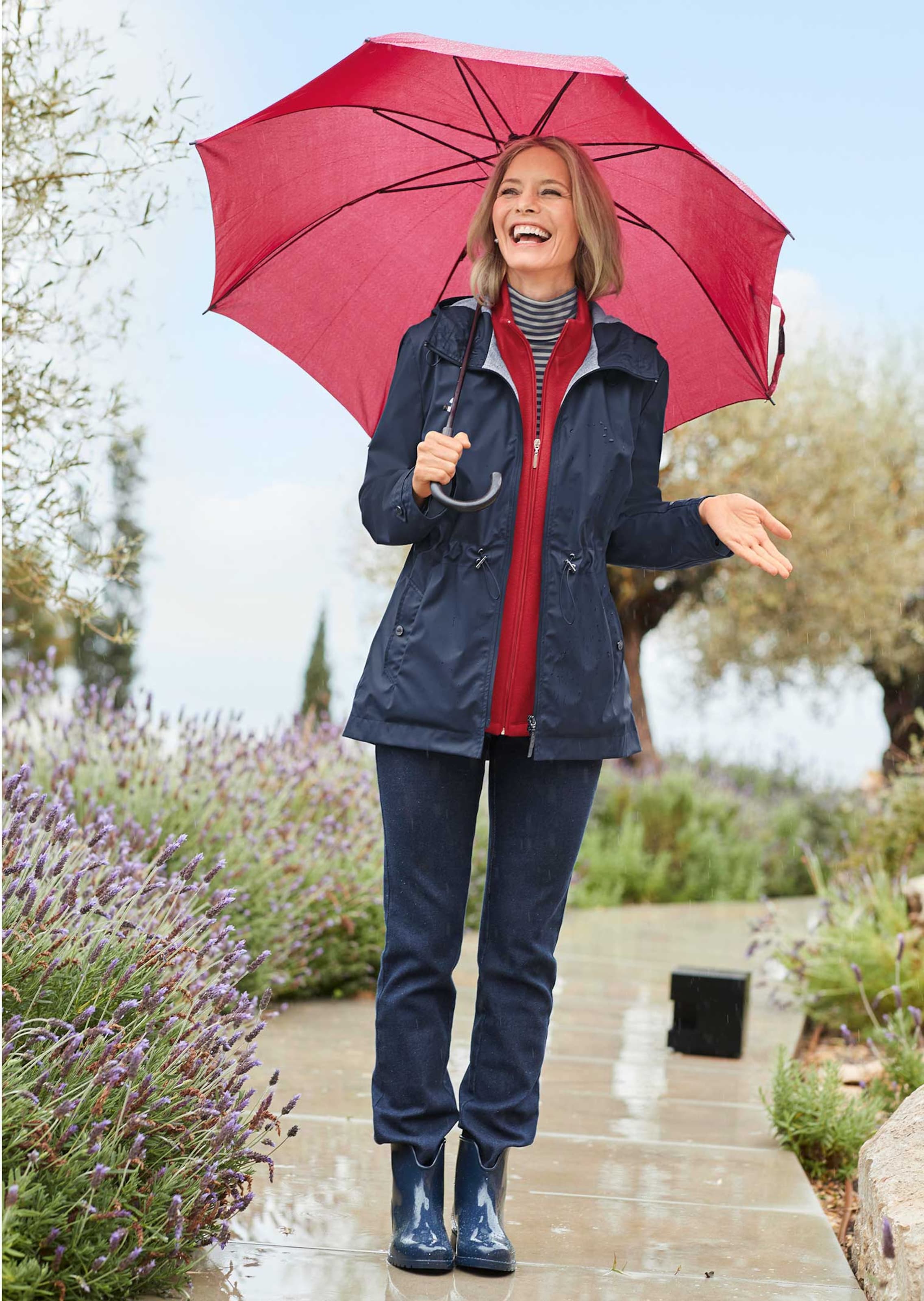 Regenjacke mit vielen funktionalen Details. Ihr Begleiter für nasse Tage ist aus wasserabweisendem Material und auch der beklebte 2-Wege-Reißverschluss lässt keinen Regen durch. Die Kapuze ist mit Gummizug gearbeitet, damit Sie auch bei größtem Sturm perfekt sitzt. Durch den Gummizug in der Taille kann die Jacke in der Weite reguliert werden. Praktisch sind auch die Riegel am Ärmel und die beiden Eingrifftaschen mit Druckknopf. Innen mit weichem Jerseyfutter gearbeitet. Länge ca. 79 cm in Gr. 46, ca. 75 cm in Gr. 23.