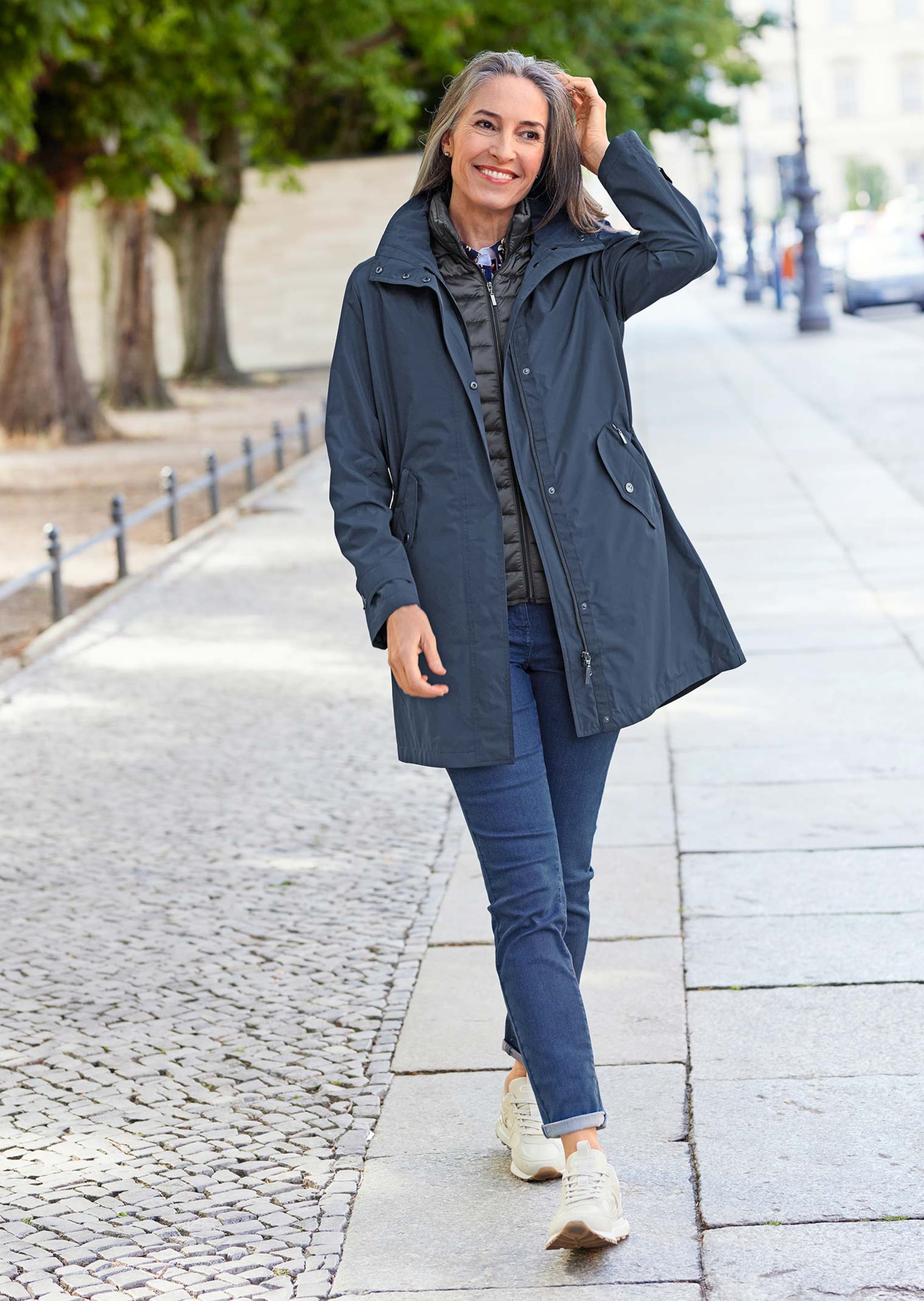 Ganzjahresjacke, die perfekt für jedes Wetter ist. Denn durch die Kombination aus Jacke und herausnehmbarer Steppweste lässt sich das schöne 3-in-1-Modell auf verschiedene Arten tragen. Entweder zippen Sie Kapuzenjacke und Weste zusammen für optimalen Wetterschutz an kalten Tagen. Oder Sie tragen Kapuzenjacke und Weste einzeln – je nach Wetterlage. Die Jacke funktioniert mit hohem Stehkragen, abnehmbarer Kapuze und innenliegendem Tunnelzug auch ideal als Windbreaker. Die doppelten Taschen sind aufwändig mit extra tiefen Taschenbeuteln gearbeitet. Der Reißverschluss ist mit einer Druckknopfblende windabweisend verdeckt. Diese sind mit GOLDNER-Logo edel versehen. Mit hochwertigen Paspelierungen und tonigen Ripsbändern. Die ökologische, wasser- und schmutzabweisende Bionic Finish ECO®-Imprägnierung mit fluorfreier Rezeptur hält Farben und Gewebe länger wie neu, lässt das Material schneller trocknen und macht die Pflege kinderleicht. Zudem ist die Qualität atmungsaktiv, windabweisend, strapazierfähig und mit UV-Schutz ausgestattet. Länge Jacke ca. 90 cm in Gr. 46, ca. 86 cm in Gr. 23. Länge Weste ca. 66 cm in Gr. 46, ca. 62 cm in Gr. 23.