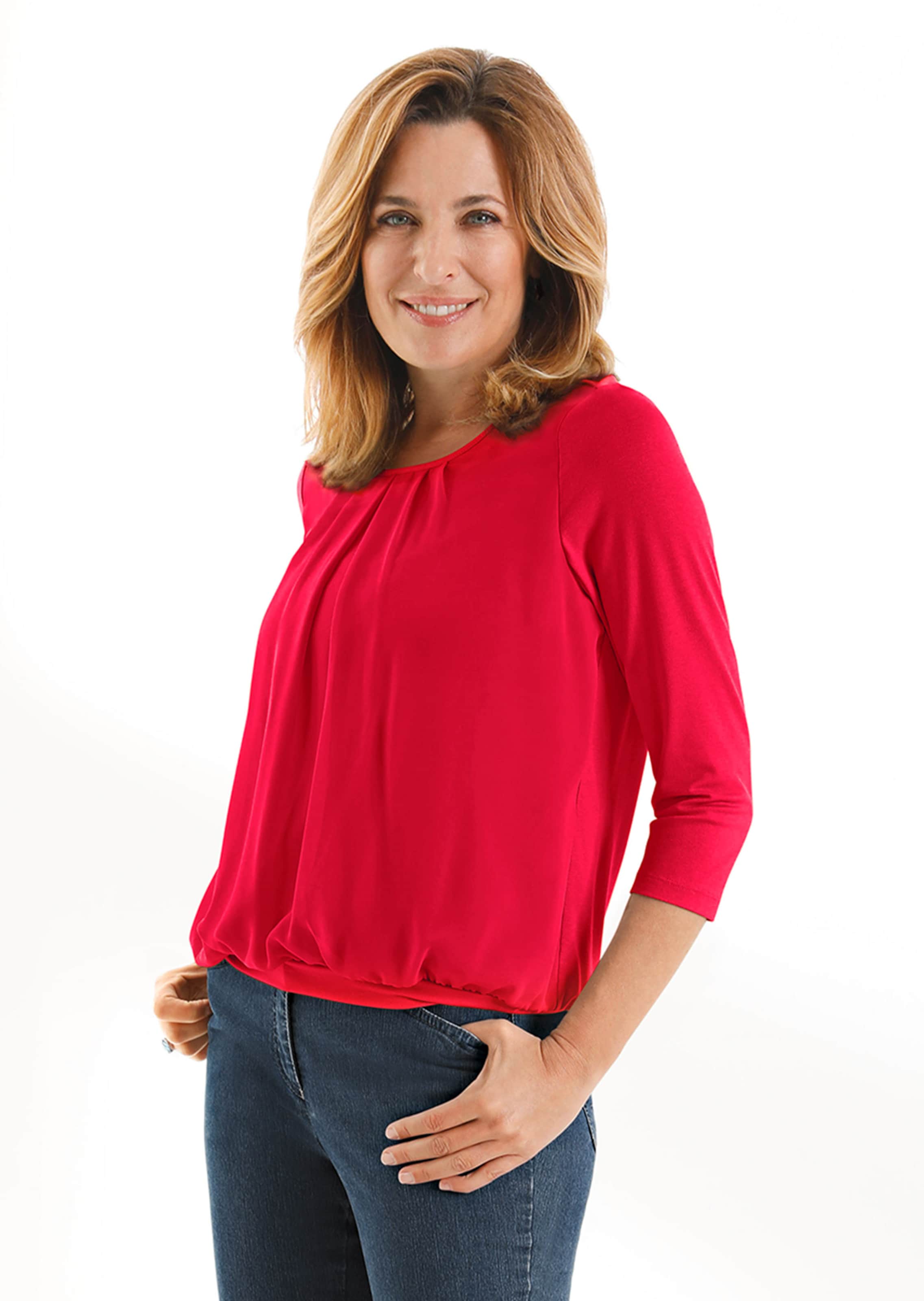 Blusenshirt in angenehmem Materialmix aus weichem Viskose-Jersey und zartem Chiffoneinsatz im Vorderteil – für eine interessante Optik. Die 3/4-Ärmel, der Rundhalsausschnitt und die bequemen Jerseybündchen lassen das Modell schön lässig wirken. Länge ca. 65 cm in Gr. 46, ca. 61 cm in Gr. 23.