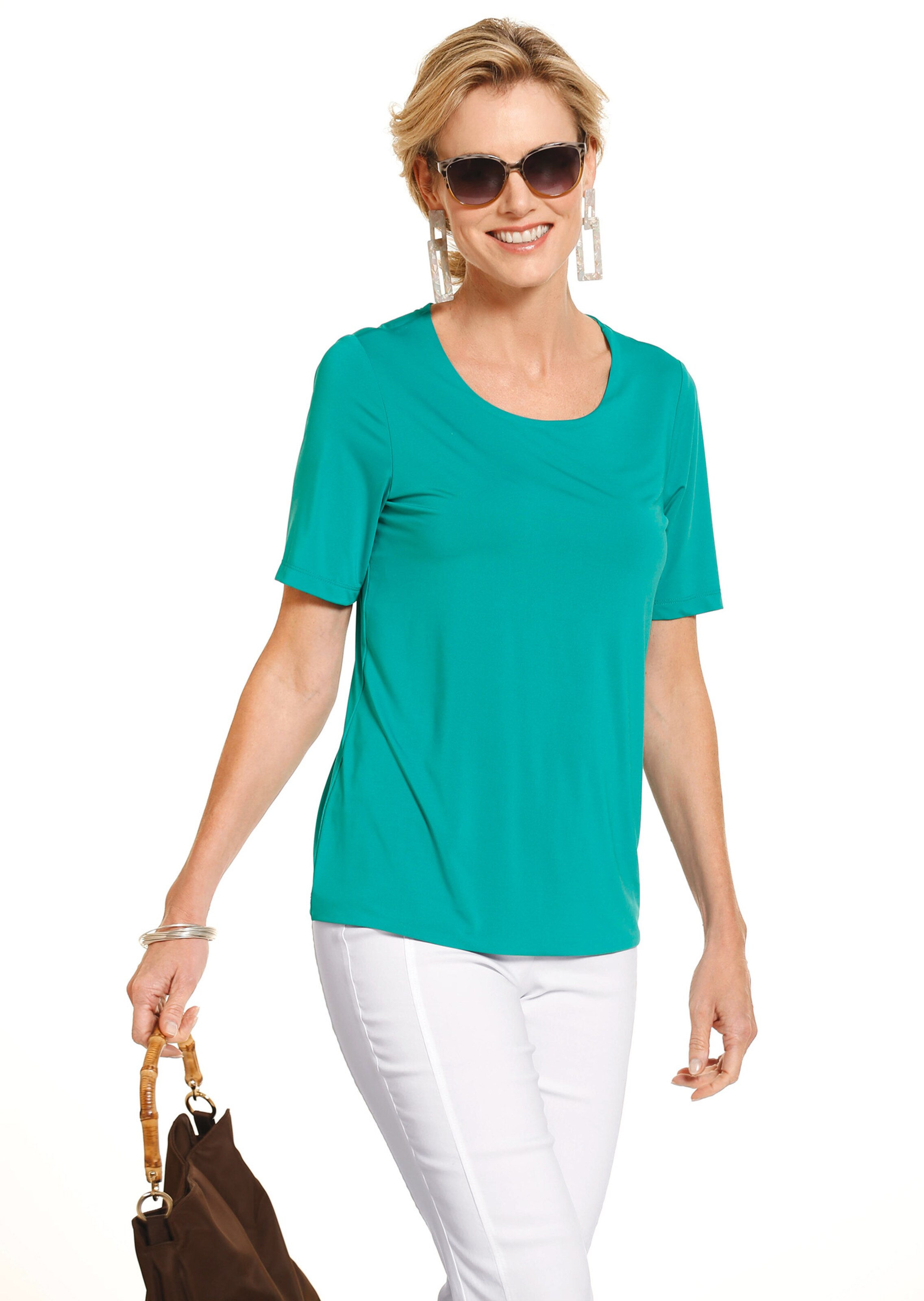 Shirt – vielseitiger Kombipartner, der zu jedem Stil passt. Mit doppellagigem Vorderteil, hier kann sich nichts abzeichnen. Die hochwertige Mikrofaser mit Elasthan ist stretchbequem, knitterarm, anschmiegsam und bleibt lange in Form. Nach dem Waschen einfach trocknen lassen und sofort wieder anziehen. Länge ca. 66 cm in Gr. 46, ca. 62 cm in Gr. 23.