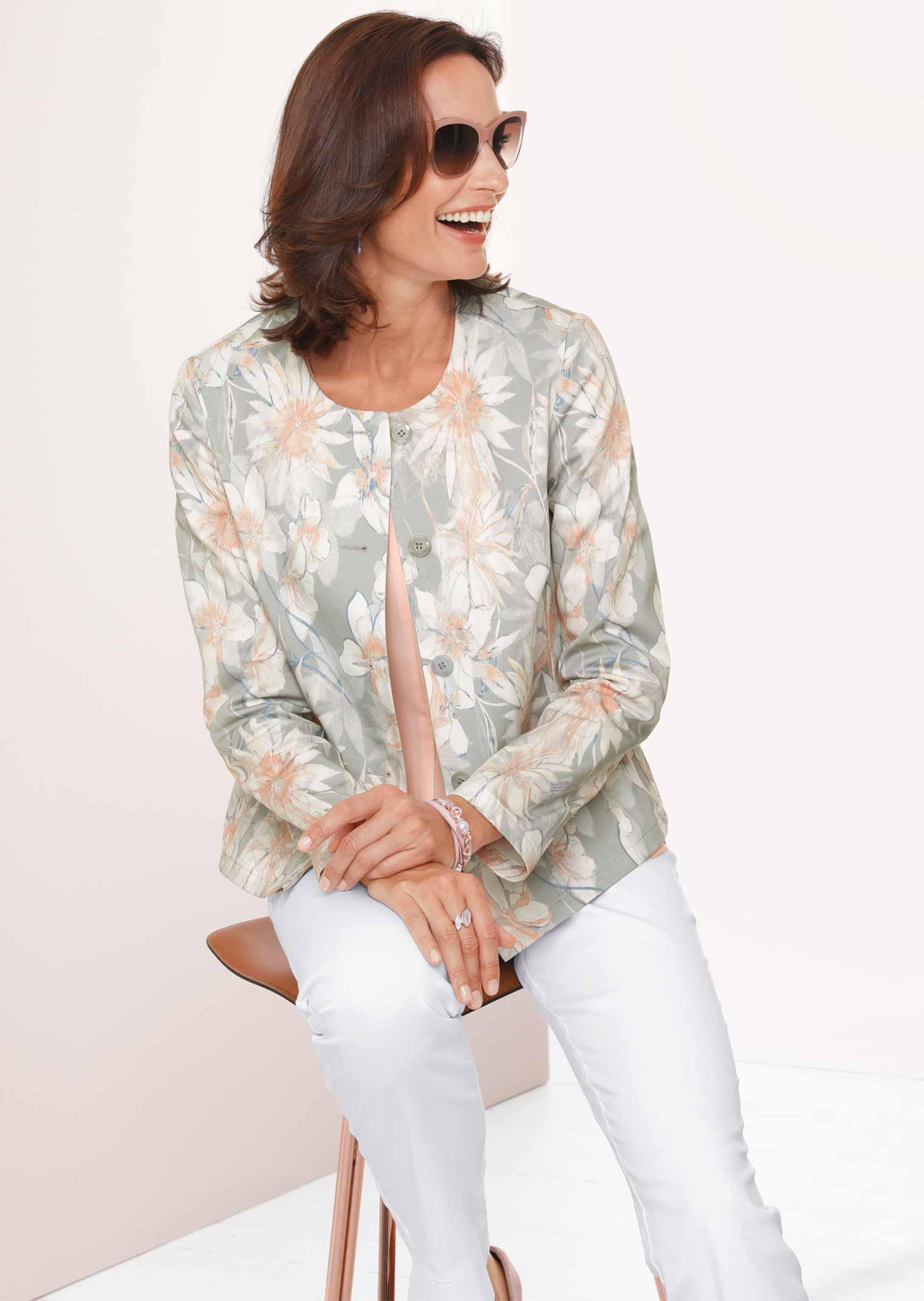 Druckblazer mit hübschem, floralem Druck in zarten Pastelltönen. Der charmante Rundhalsausschnitt und die edlen Knöpfe in Perlmuttoptik machen das ungefütterte Modell zu einem Favoriten für elegant-feminine Auftritte. Mit Nahttaschen und Wiener Nähten für die perfekte Passform. Angenehm leichte Reiseware. Länge ca. 65 cm in Gr. 46, ca. 61 cm in Gr. 23.