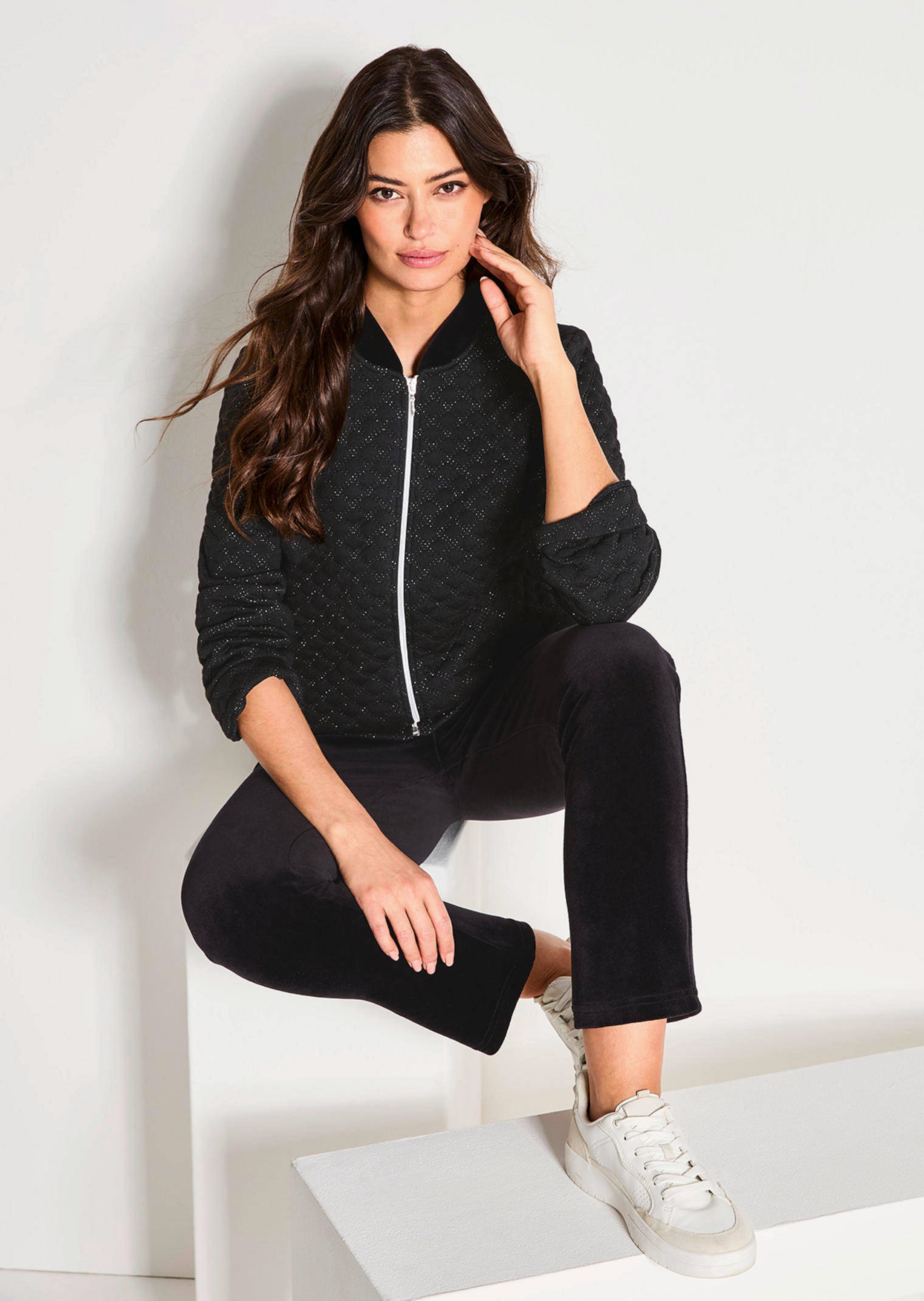 Freizeitanzug von COMODO – ideal für entspannte Stunden. Die Jacke in modernem Rautenstepp setzt mit dezentem Glanzgarn exquisite Highlights. Besonders weich und wärmend, ergänzt durch einen kuscheligen Stehkragen aus Nickiware. Mit durchgehendem Reißverschluss, zwei Eingriffstaschen und geraden Abschlüssen an Ärmeln und Saum. Die schmal geschnittene Schlupfhose aus softer Nickiqualität sitzt angenehm bequem – ein Wohlfühl-Ensemble für jeden Tag.