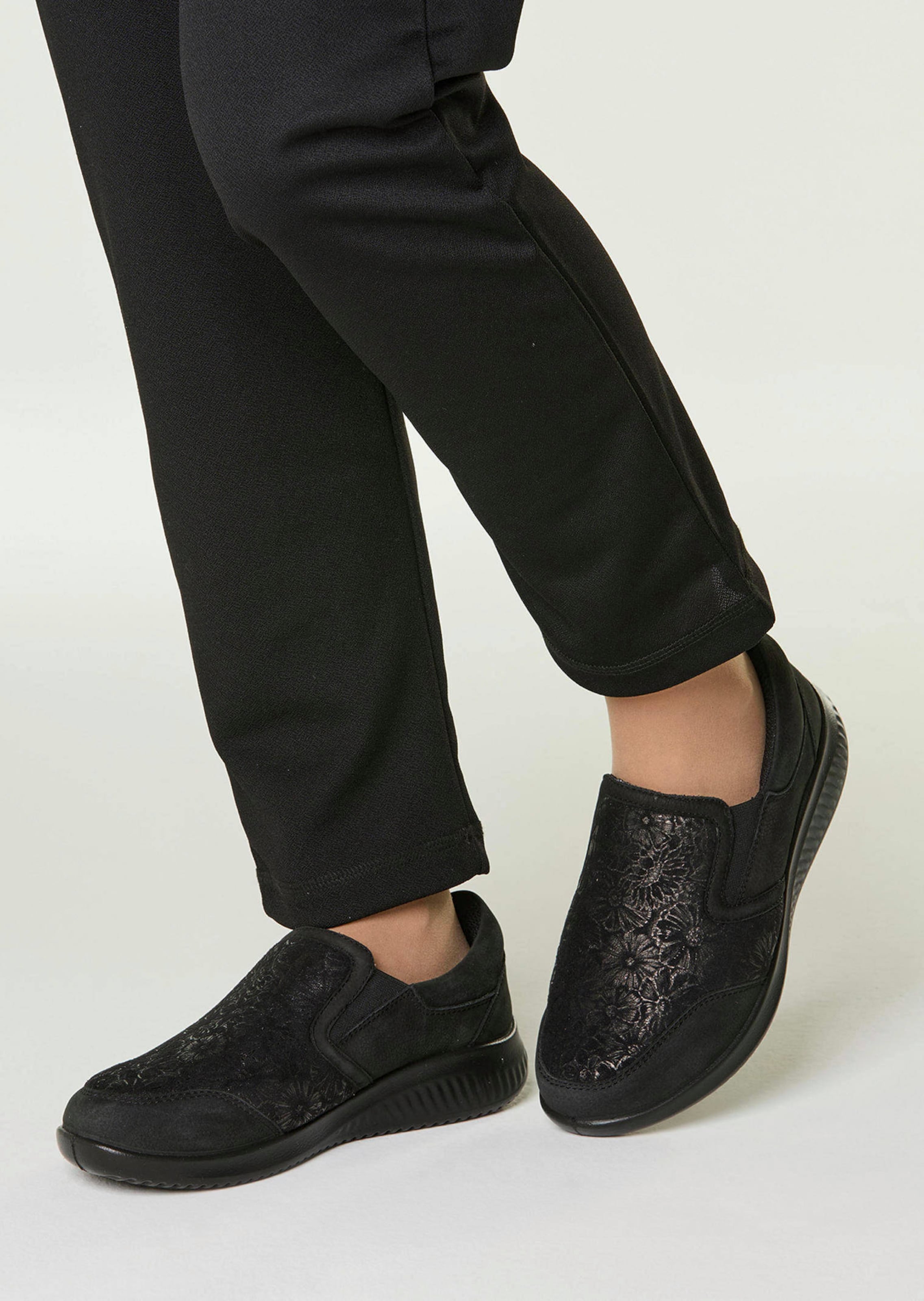 Slipper von JOMOS – optimaler Komfort bei Hallux valgus! Obermaterial aus Leder und Stretch – passt sich perfekt an. Klettverschluss für einfaches Anziehen. Textile Innenausstattung. Wechselfußbett mit Microfaser-Decksohle. Leichte PUR-Laufsohle.