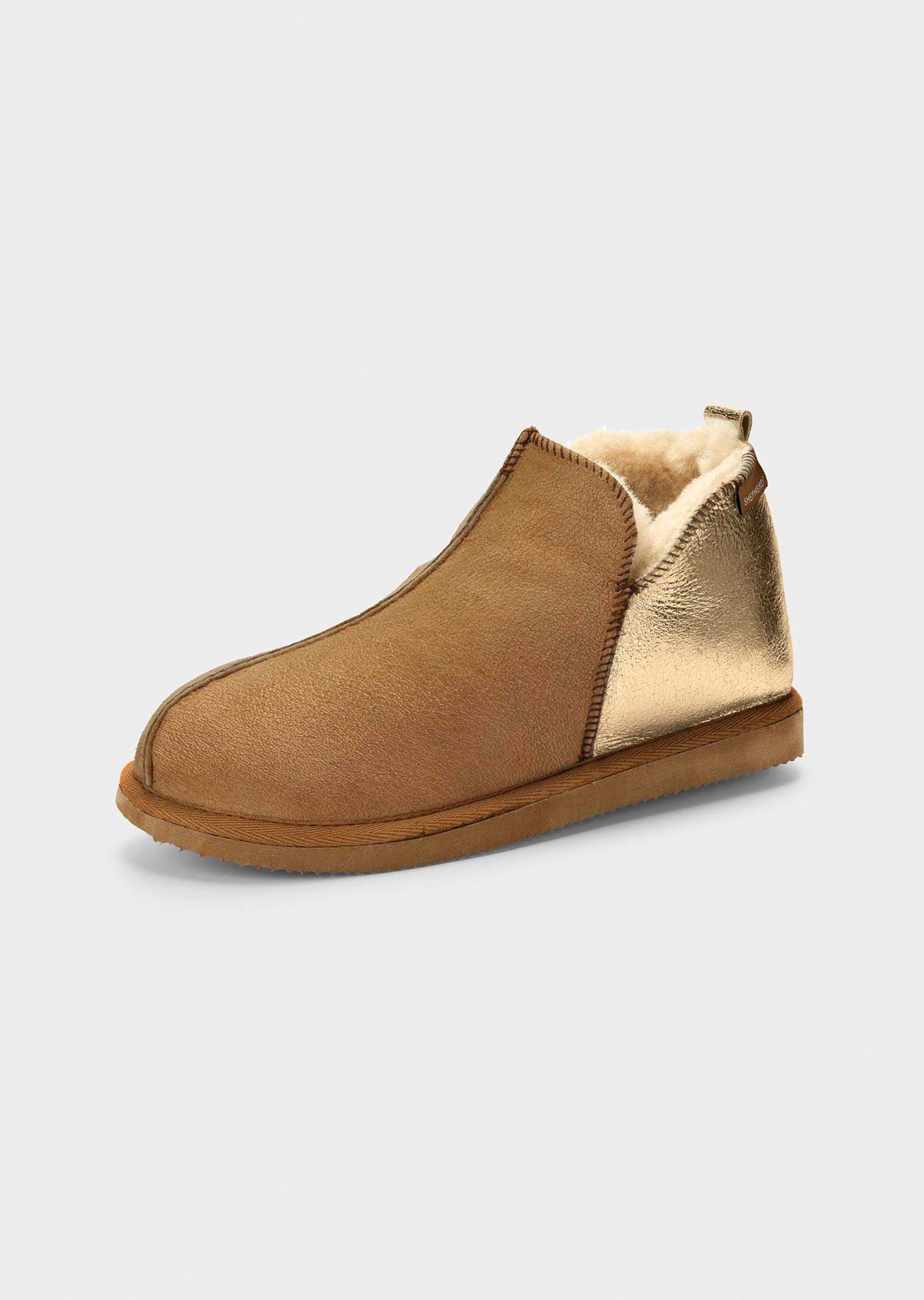 Hausschuhe von SHEPHERD, rundum aus echtem Lammfell gearbeitet – kuschelig weich und angenehm warm. Dekorativer Blickfang sind die Metallic- bzw. Animal-Akzente im Fersenbereich. Mit EVA-Laufsohle.