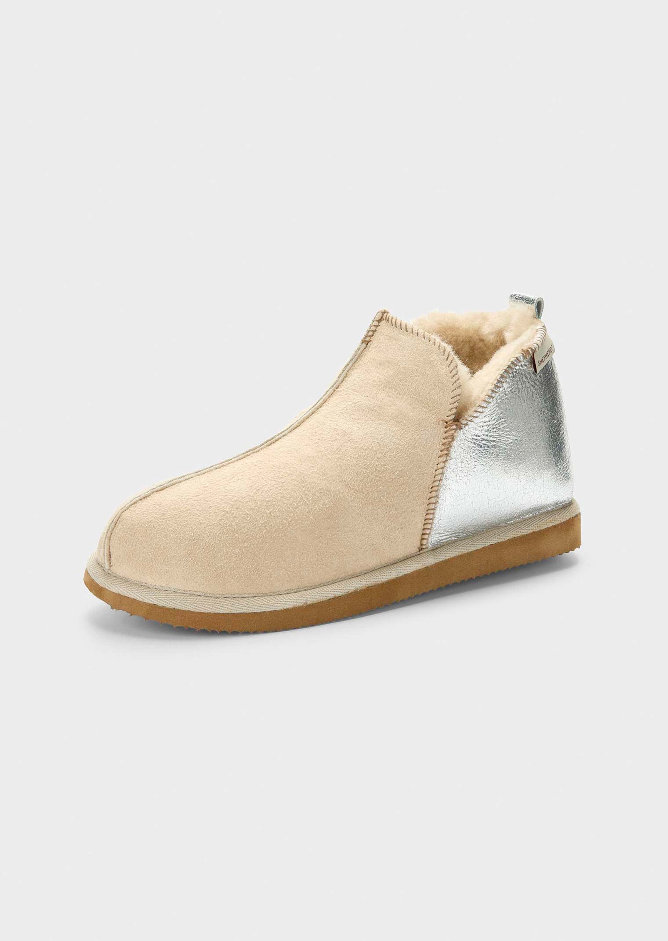 Hausschuhe von SHEPHERD, rundum aus echtem Lammfell gearbeitet – kuschelig weich und angenehm warm. Dekorativer Blickfang sind die Metallic- bzw. Animal-Akzente im Fersenbereich. Mit EVA-Laufsohle.