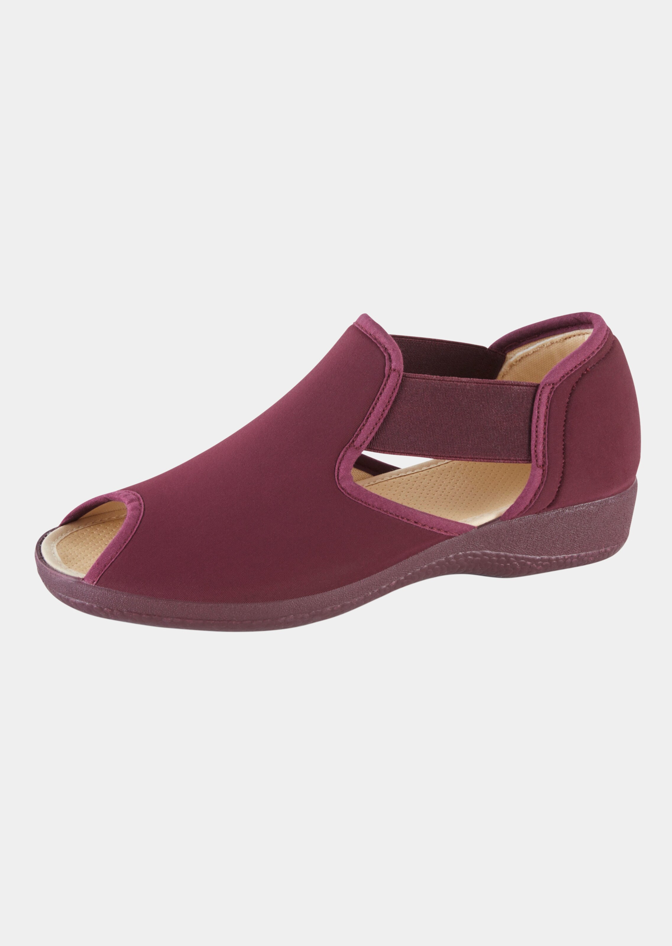 Hausschuhe in G-Weite in Stretch-Qualität – so passt sich der Schuh perfekt jedem Fuß an und sorgt für ein optimales Tragegefühl. Die beidseitigen Elastikeinsätze erleichtern das Anziehen und geben zusätzlichen Halt. Die offenen Zehen- und Seitenpartien bieten luftigen Komfort auch an wärmeren Tagen. Mit rutschsicherer Laufsohle aus echtem Kautschuk.