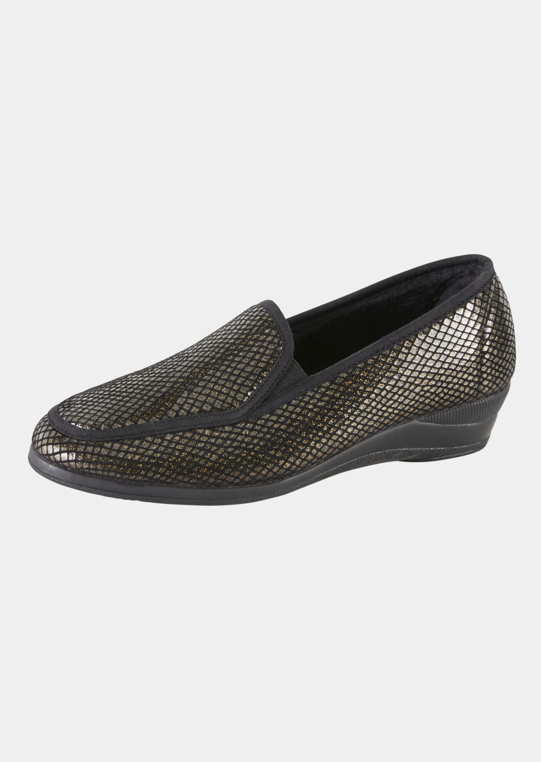 Hausschuh in F-Weite – das glänzende Obermaterial mit elegantem Foliendruck und Rautenmuster verleiht dem Modell einen Hauch von Raffinesse. Kleine Elastikeinsätze sorgen für einen angenehmen Sitz, während die rutschsichere Laufsohle aus echtem Kautschuk zuverlässigen Halt bietet. Ein Hingucker für alle, die auch zu Hause Wert auf eine geschmackvolle Optik legen.