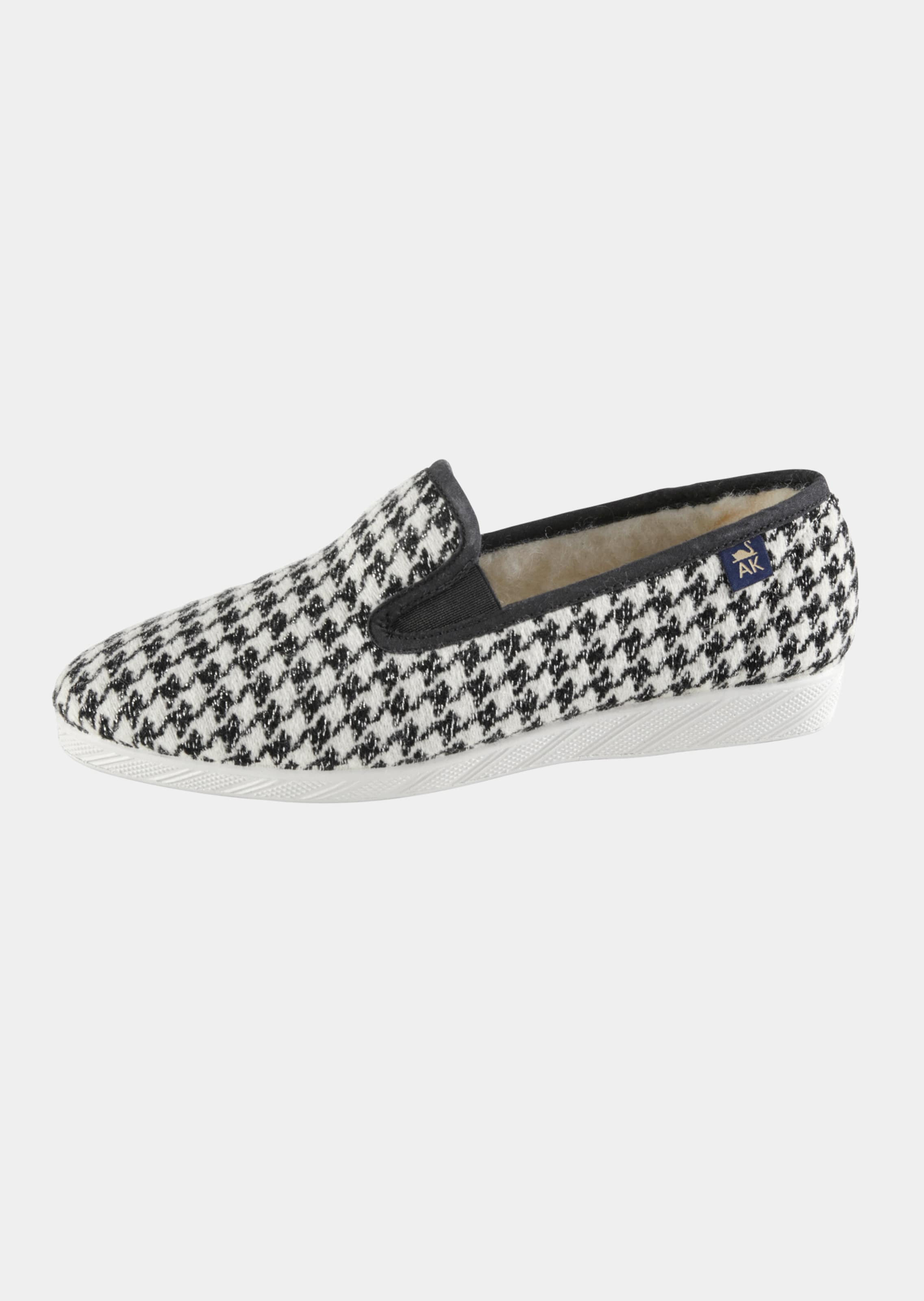 Hausschuhe in F-Weite – die schmale Slipperform passt optimal für schlanke Füße. Das Obermaterial aus Textil beeindruckt mit einem klassischen Hahnentrittmuster. Innen sorgen Futter und Decksohle aus reiner Schurwolle für angenehm warme Füße. Mit rutschsicherer Laufsohle aus echtem Kautschuk.